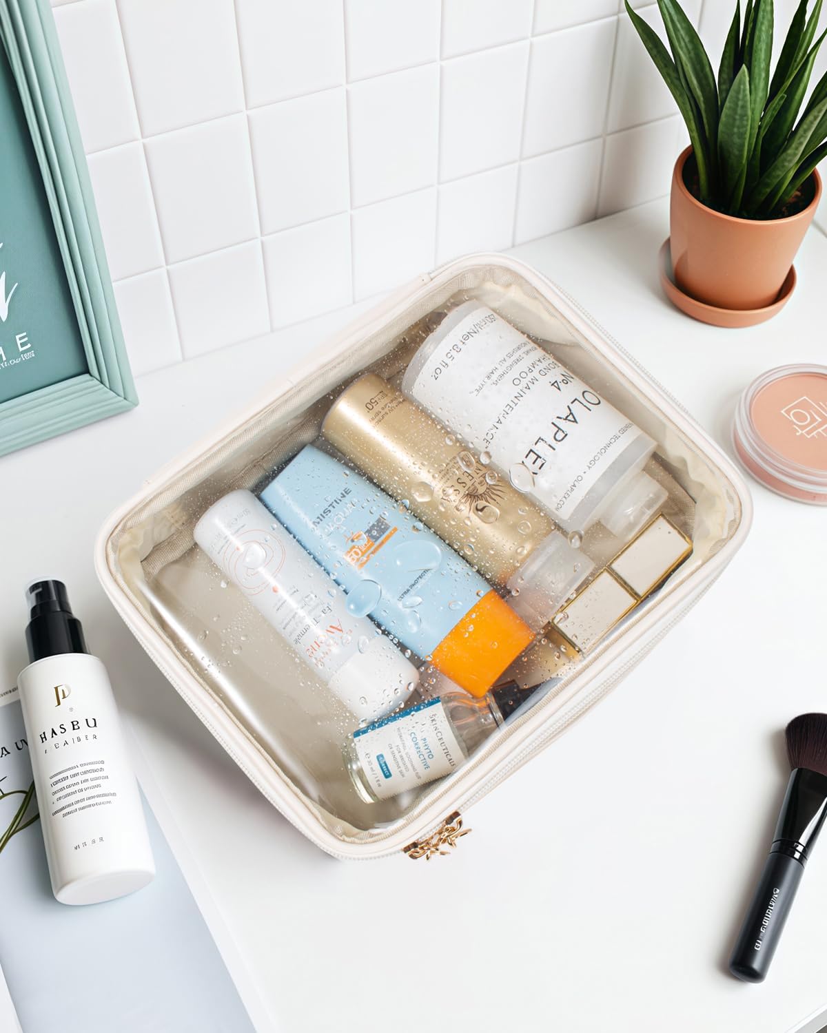 - ✈️CLEAR MAKEUP BAG TRAVELING: Clear makeup bag are transparent and durable, eco-friendly Waterproof material to see and get items quickly. the PVC material is also waterproof, Design with translucent material and double large opening zipper, allows you to see what is stored and where it is and making it convenient to pack and save time to find what you need. if your have cosmetics on your bag, it will be very easy to clean, to keep your travel bags neat and clean.