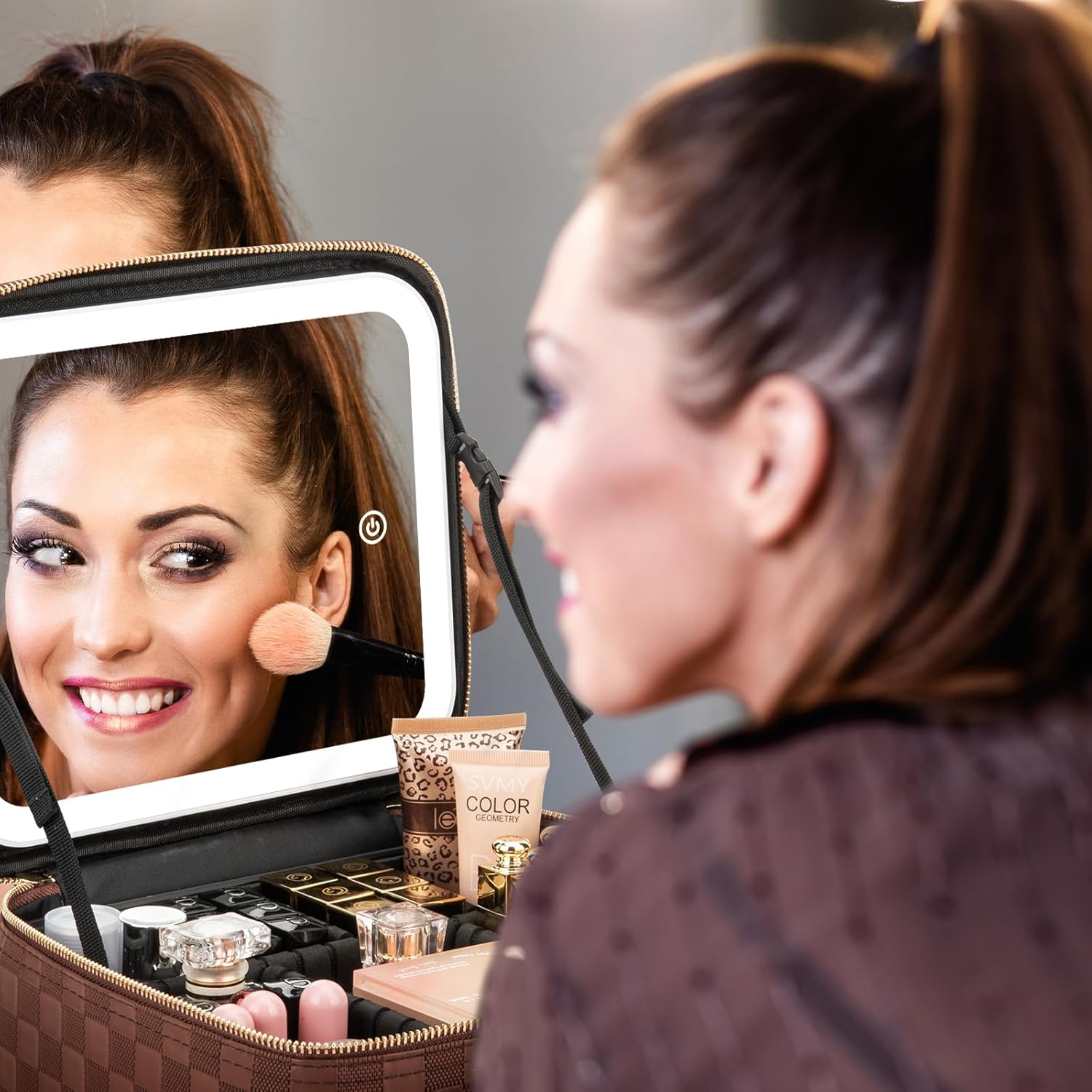 Makeup Travel Train Case with Mirror LED Light 3 Adjustable Brightness Large Cosmetic Bag Portable Storage Adjustable Partition Waterproof Makeup Brushes Make up Jewelry Gift for Women