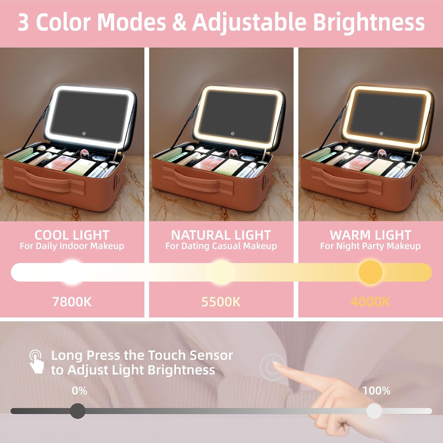 15"×11" Large Pink Makeup Bag with Mirror, Personal Item Travel Bag with Makeup Mirror 3 Lights, Waterproof Train Case with Mirror and Adjustable Dividers,Professional Lighted Makeup Case
