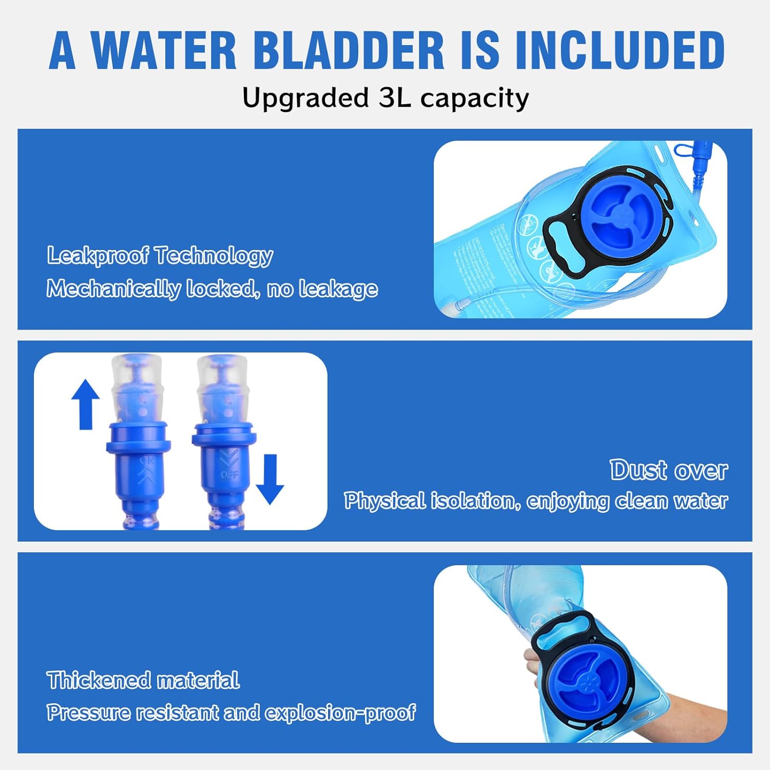- Versatile Outdoor Companion : Whether cycling, hiking, or trail running, this hydration backpack comes with a 3L hydration bladder and features a large insulated compartment to keep your water cool for hours. Two mesh side pockets offer extra space for bottles or umbrellas