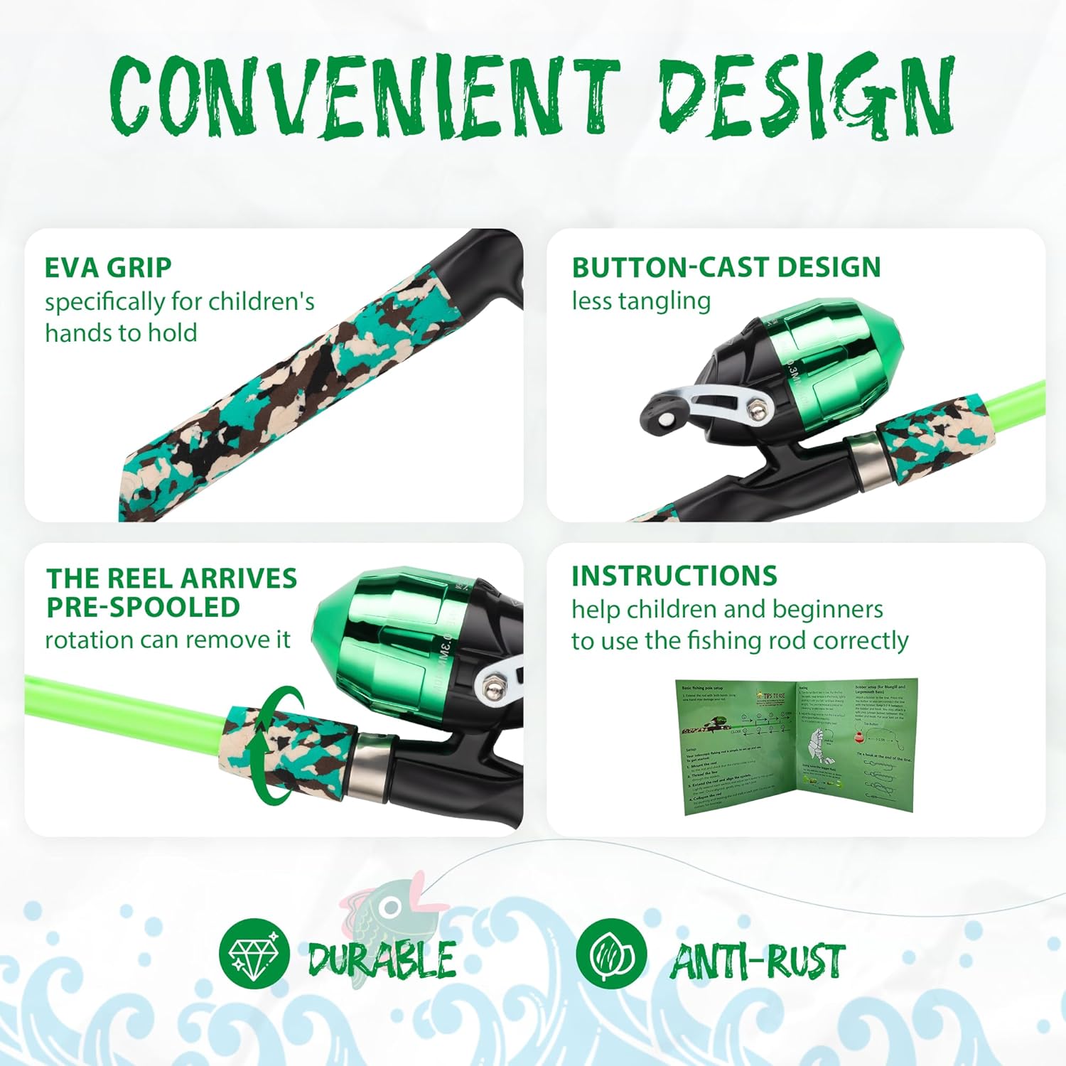 - THE SUITABLE PRESENT FOR CHILDREN: The youth fishing pole is suitable for children over 5 years old. It is a great present for birthdays, Children's Day, and Christmas. Please follow the instructions, if you have any questions, please tell us for a satisfactory solution. Tips: Tighten the fishing line when collecting the fishing rod to avoid entanglement of the fishing line