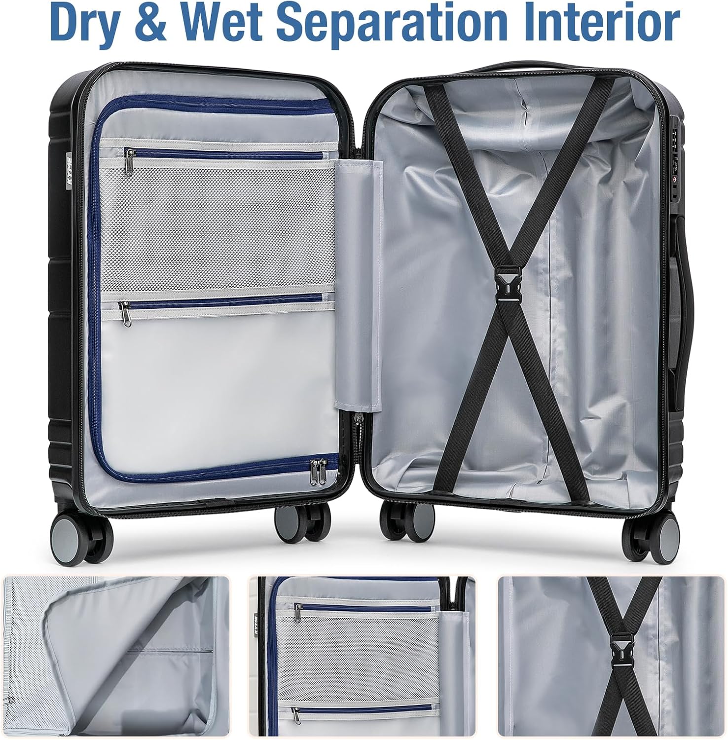 - SPACIOUS INTERIOR: These hardshell expandable 22x14x9 carry-on luggage has multiple storage compartments for easy packing.The main compartment has "X"-shaped cross straps to keep clothes in place. The left side compartment has two zipped mesh pockets for wet and dry storage.Soft silicone handles on the top and sides provide a variety of comfortable carrying options