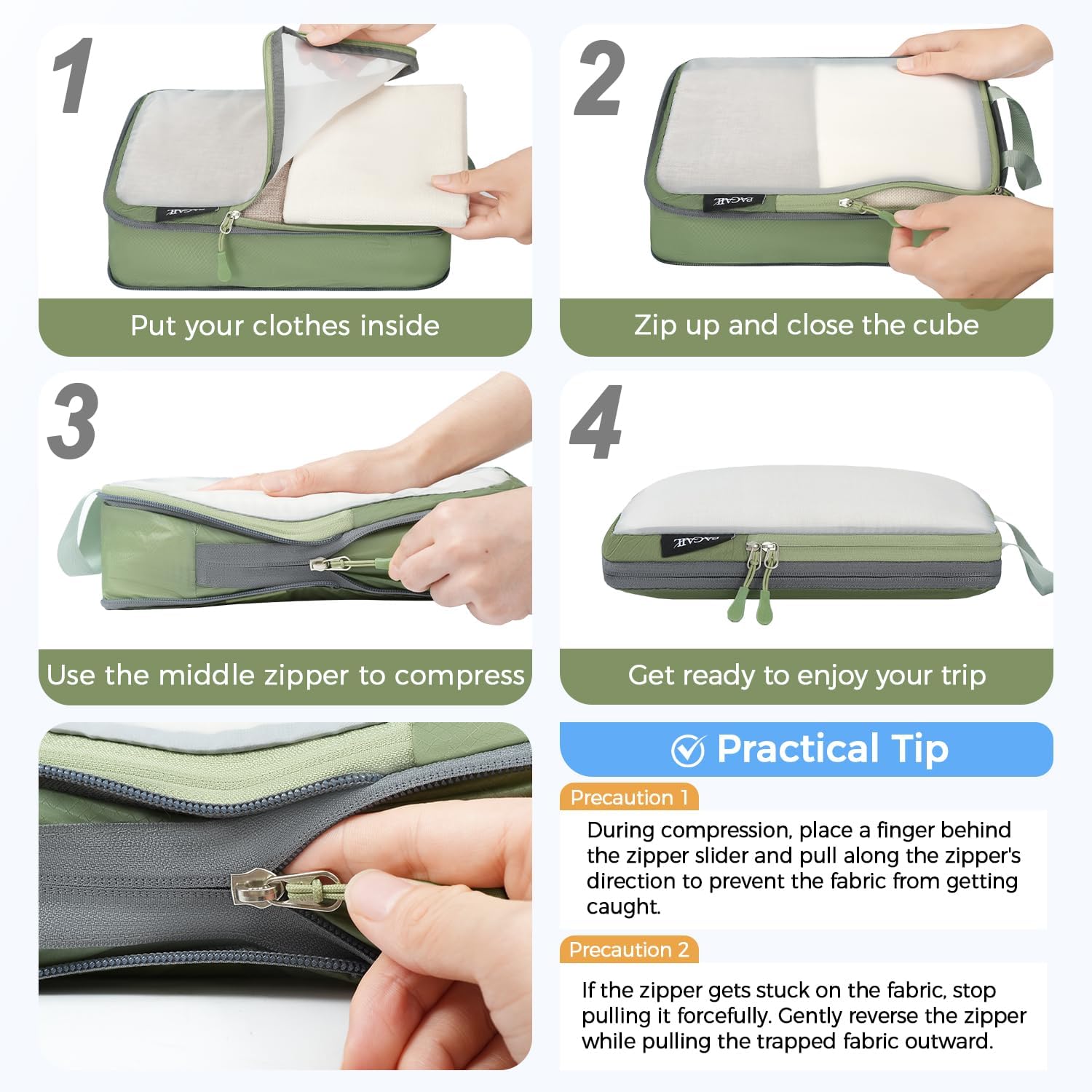 - How to Compress:The cube is compressed by the middle zipper; Using steps: 1)Fold and flatten clothes 2)Pack clothes in the cube and zip the front zipper 3) Put a finger on the back of the middle zipper when compressing to avoid zipper get stuck in fabric
