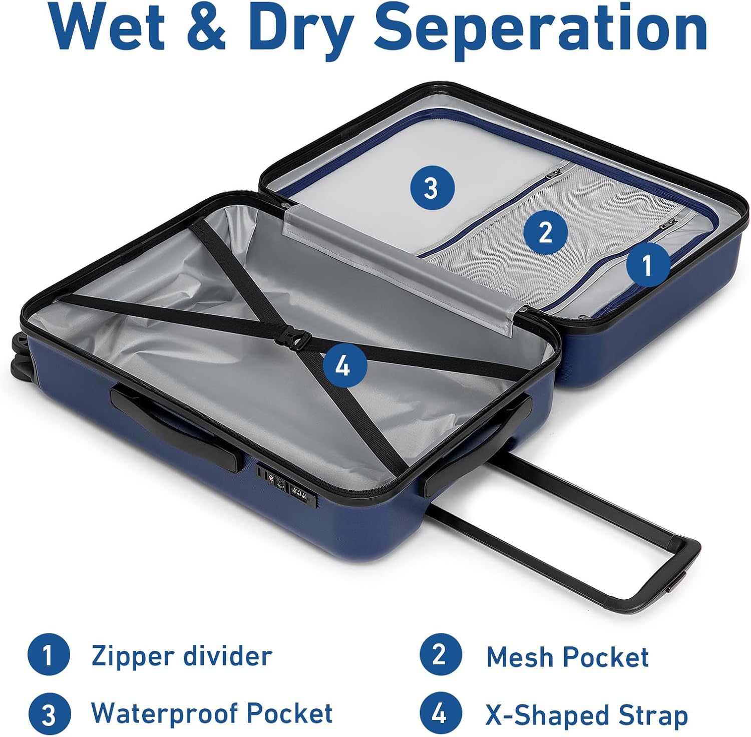 - 2 Pieces Luggage Sets Includes:20" carry on(21.7 x 13.8 x 9.8 inches) and 24" spinner suitcase(26.7 x 16.7 x 10.6 inches).Carry-on luggage suitable for short trips and 24" checked luggage maximize your packing power and the ideal checked bags for longer trips