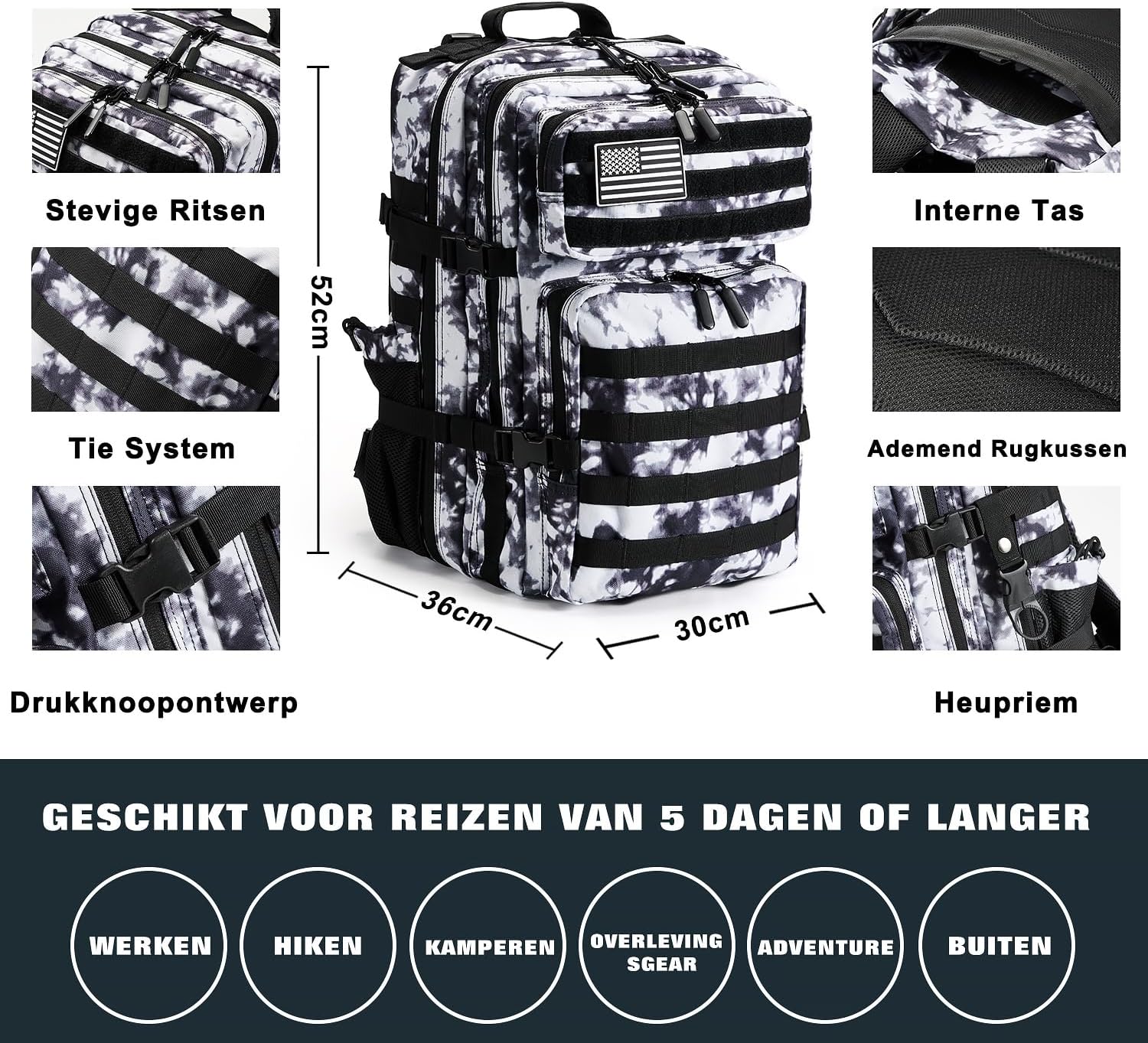 - 🏕️【45L Camping Backpack】The tactical backpack has multiple compartments and double zipper closure pockets, including 2 large compartments, 2 small front compartments and 1 back compartment. The tactical backpack measures approximately 11.81 inches x 19.68 inches x 11.81 inches (W x H x D). The military tactical MOLLE backpack is made of high-density double-stitched 900D Oxford cloth and nylon fabric, which is durable and waterproof.