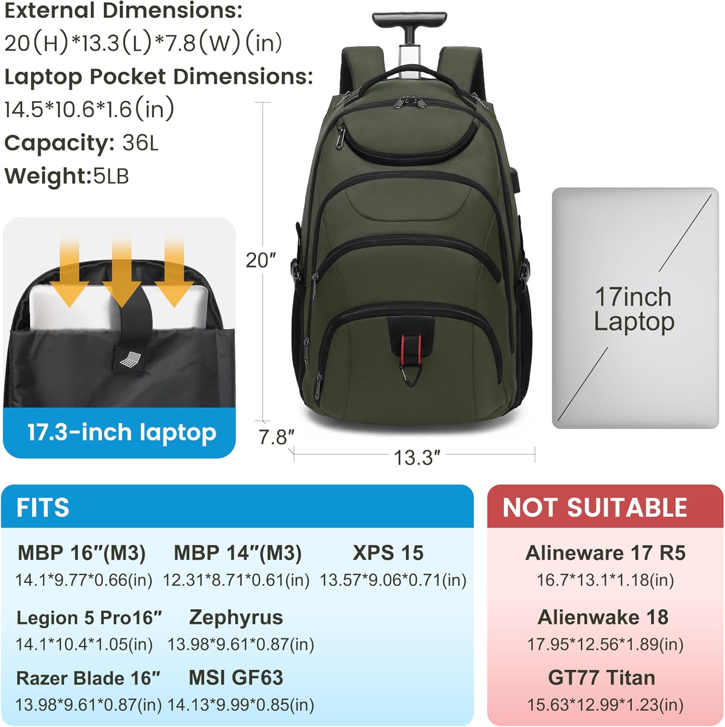 - LARGE CAPACITY TRAVEL BACKPACK: This is a portable backpack for students or business people. It has 5 zippered compartments for added capacity, including pen slots, a key ring, 4 inside pockets, 2 side pockets and 1 back pocket. The padded center compartment can hold up to 17.3-inch laptops, including 15.6-inch, 14-inch and 13-inch macbooks.The main compartment of this roller backpack has a 45-liter capacity for carrying school books and laptops or packing travel clothes