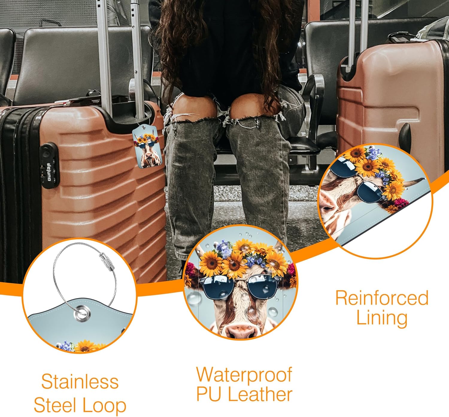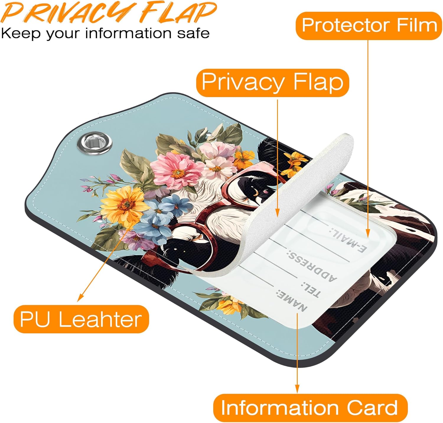 2 Pack Luggage Tag for Suitcase Cool Cow in Sunglasses Leather Travel Cruise Luggage Tag with Stainless Steel Loop Name ID Label Privacy Cover for Adults Teens Travel Bag Labels Set