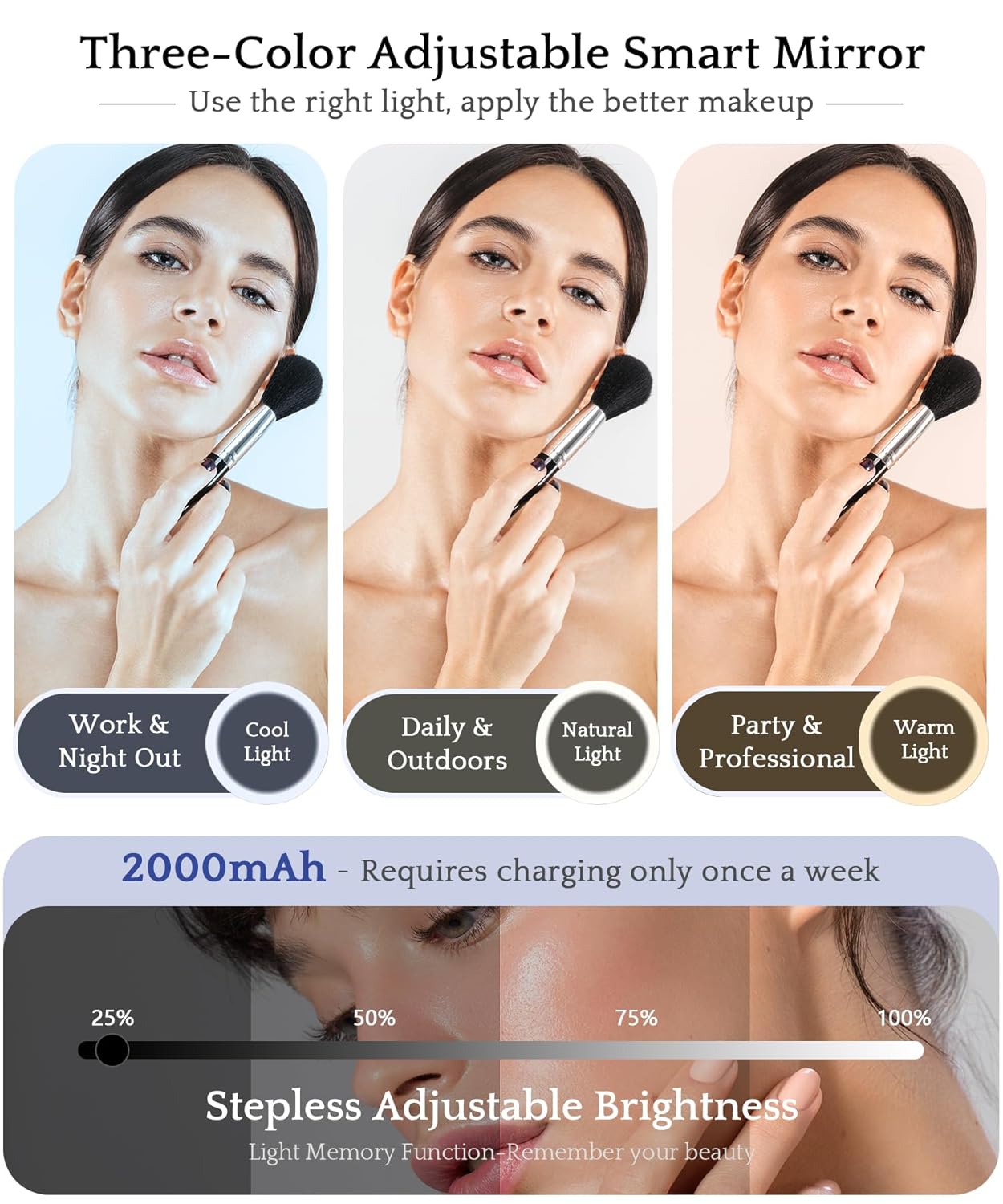- š”ćDetachable Smart Fill Light MirrorćEnhance your makeup routine with this smart fill light mirror featuring adjustable light intensity and a memory function. The 360° adjustable mirror stand ensures no angle is missed, while the touch switch offers cool, natural, or warm light options for true-to-life makeup application. Say goodbye to battery worries with its long-lasting 2000mAh battery.