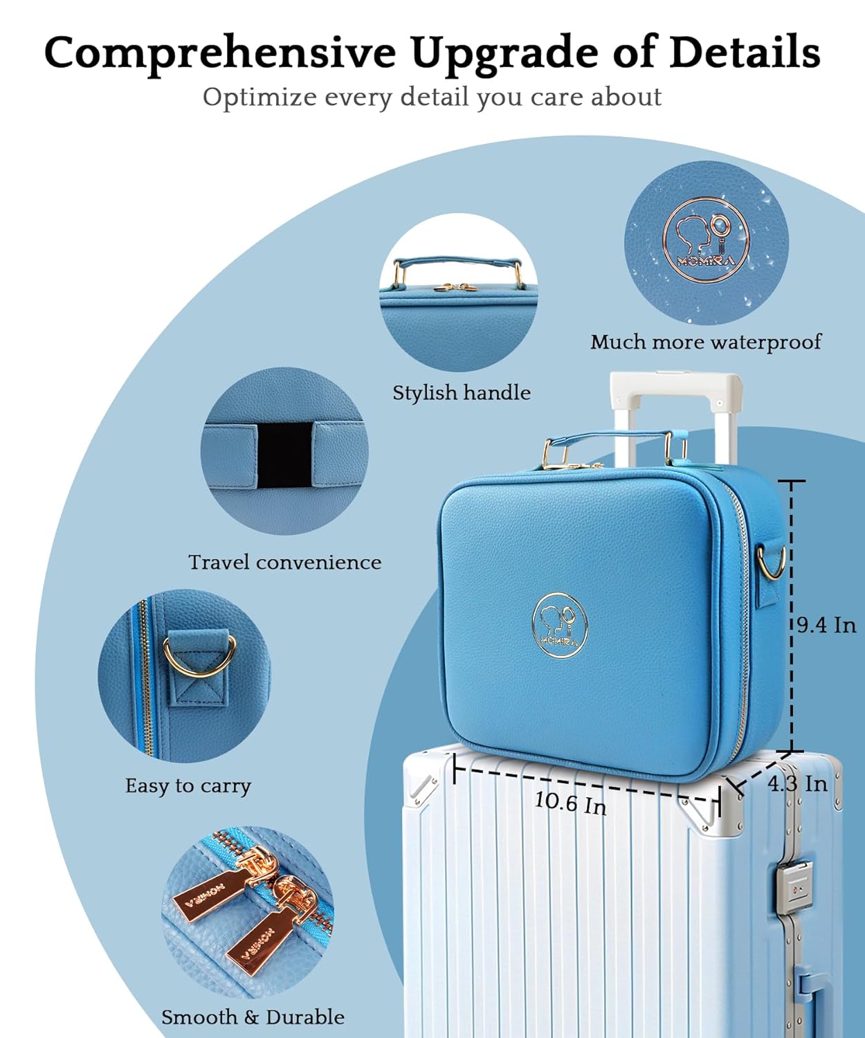 MOMIRA Travel Makeup Bag Cosmetic Bag with Lighted Mirror, Adjustable Brightness in 3 Color Scenarios/Detachable makeup mirror, All-round Upgrade, Waterproof, Gift for Women -Azure Blue