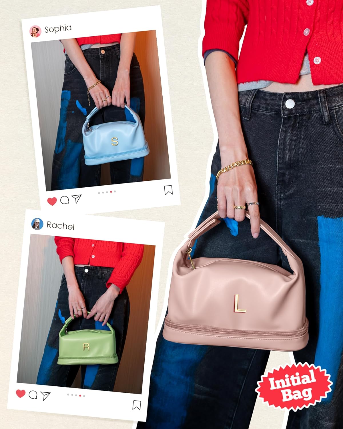 - 【Double-layer Design】The monogrammed makeup bags is double-layer with a unique design of upper and lower storage areas. The bottom compartment is great for storing cosmetics, eye shadows, makeup brushes, and other items. The top layer features a large opening for easy access, along with two small compartments for lipsticks and earrings.