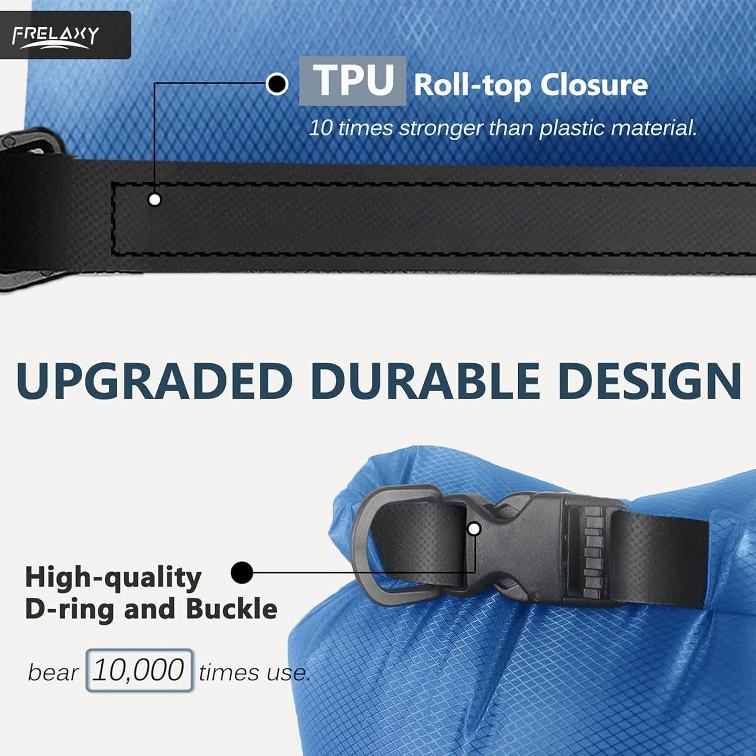 - UPGRADED DURABLE DESIGN: The dry bag is made of diamond ripstop polyester, and the roll-top closure is made of strong TPU material that is 10 times stronger than plastic. The sturdy D-ring and buckle can withstand up to 10000 uses and are easy to attach to your backpack.