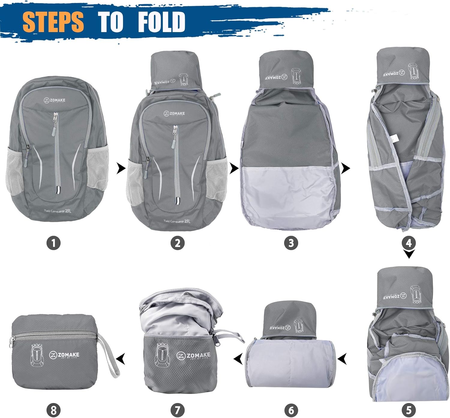 - REASONABLE AND ORDERLY: Our ultralight packable backpack capacity is 25L,and the pocket structure layout is reasonable and orderly.One main bag can accommodate sandwich lunch boxes and inner partitions to accommodate A4 paper size files;One inner bag can store important small items such as passports;2 front bags can store small booklets such as travel guidelines;2 side bags can store water bottles and umbrellas