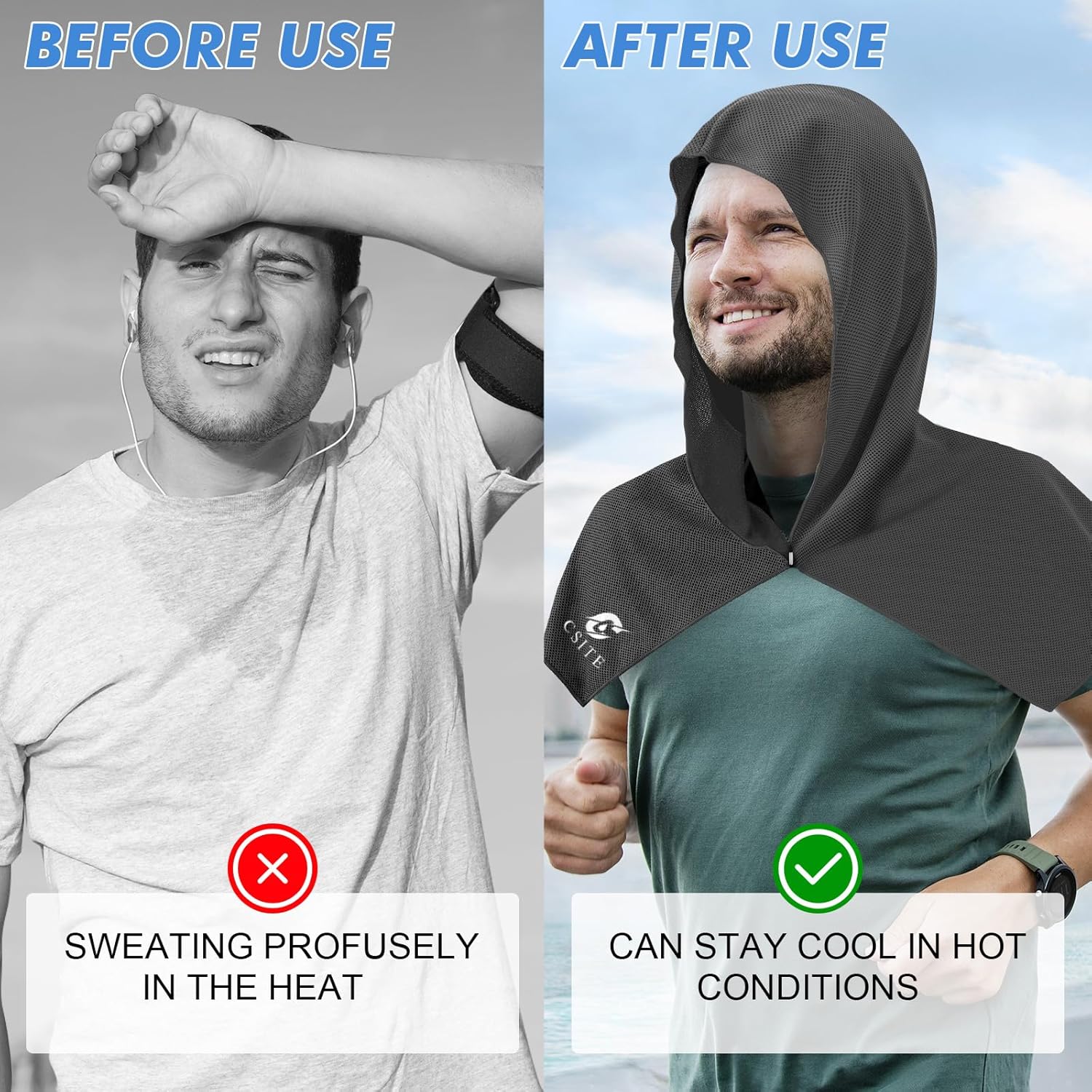 - SUMMER ESSENTIAL: Cooling Hoodie Towel is perfect for exercise enthusiasts who love sports, hiking, exercise, golf, camping,fishing and fitness; It is also ideal for outdoor workers who work in hot weather; Using a cooling hoodie towel for neck and face will help you avoid sunburn or heat stroke and bring a refreshing; You can also use it to relieve the headache caused by fever, and the physical cooling of burns. It's a great summer accessories for any activities