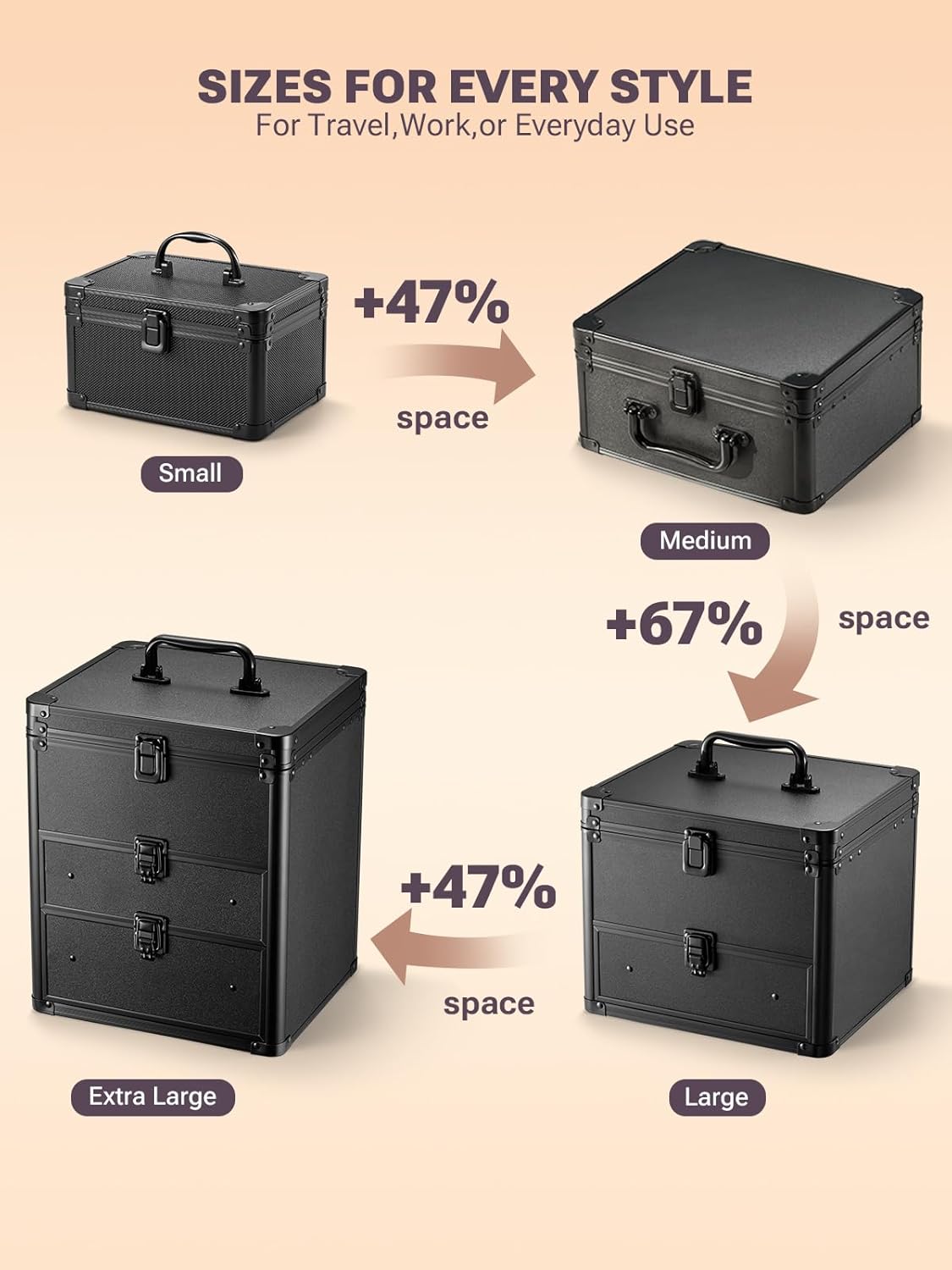 - Professional Hard Makeup Travel Case: Measuring 9.6x8.3x4.9 inches, this portable case is ideal for all makeup artists. Made with ABS aluminum and metal-reinforced corners for durability, it features a latch with a quick rebound lock