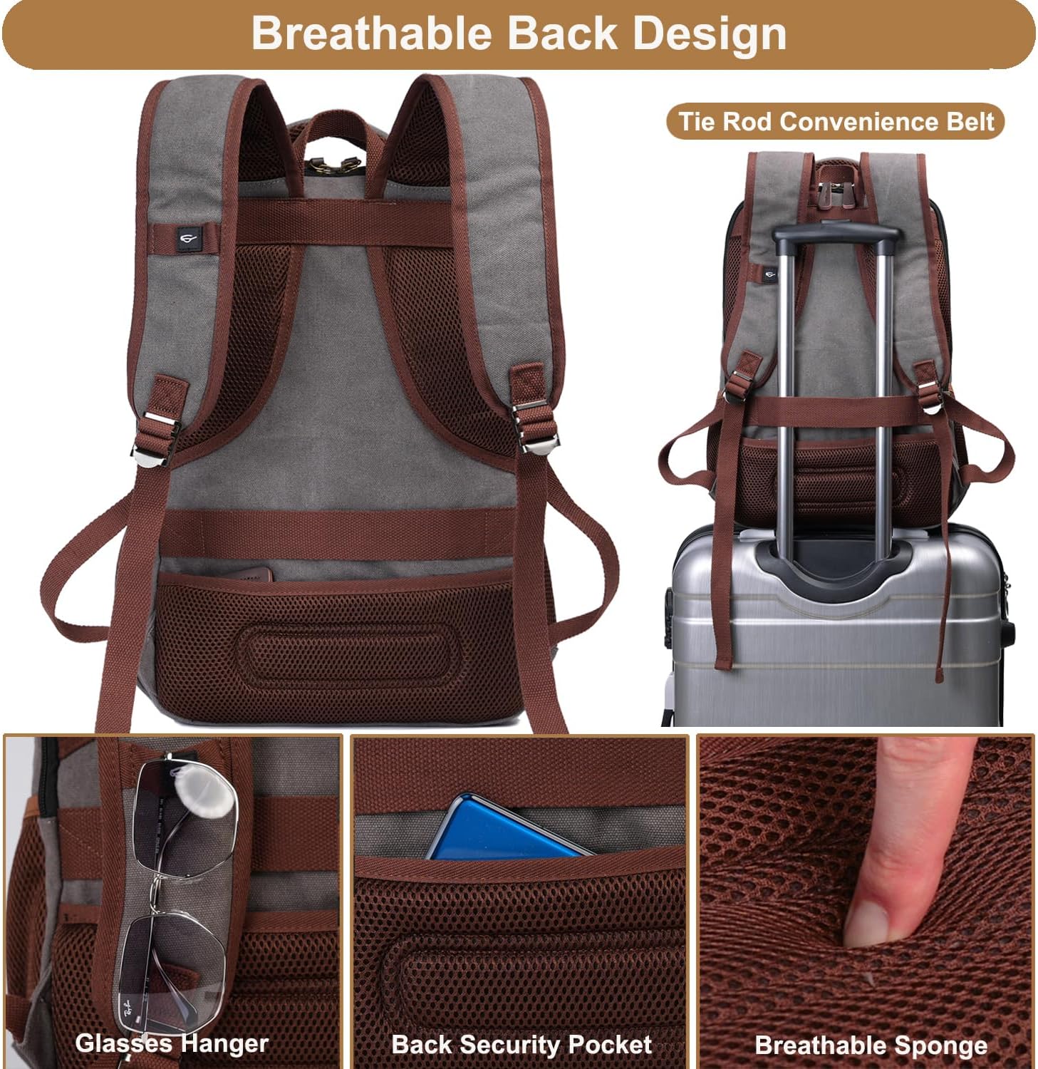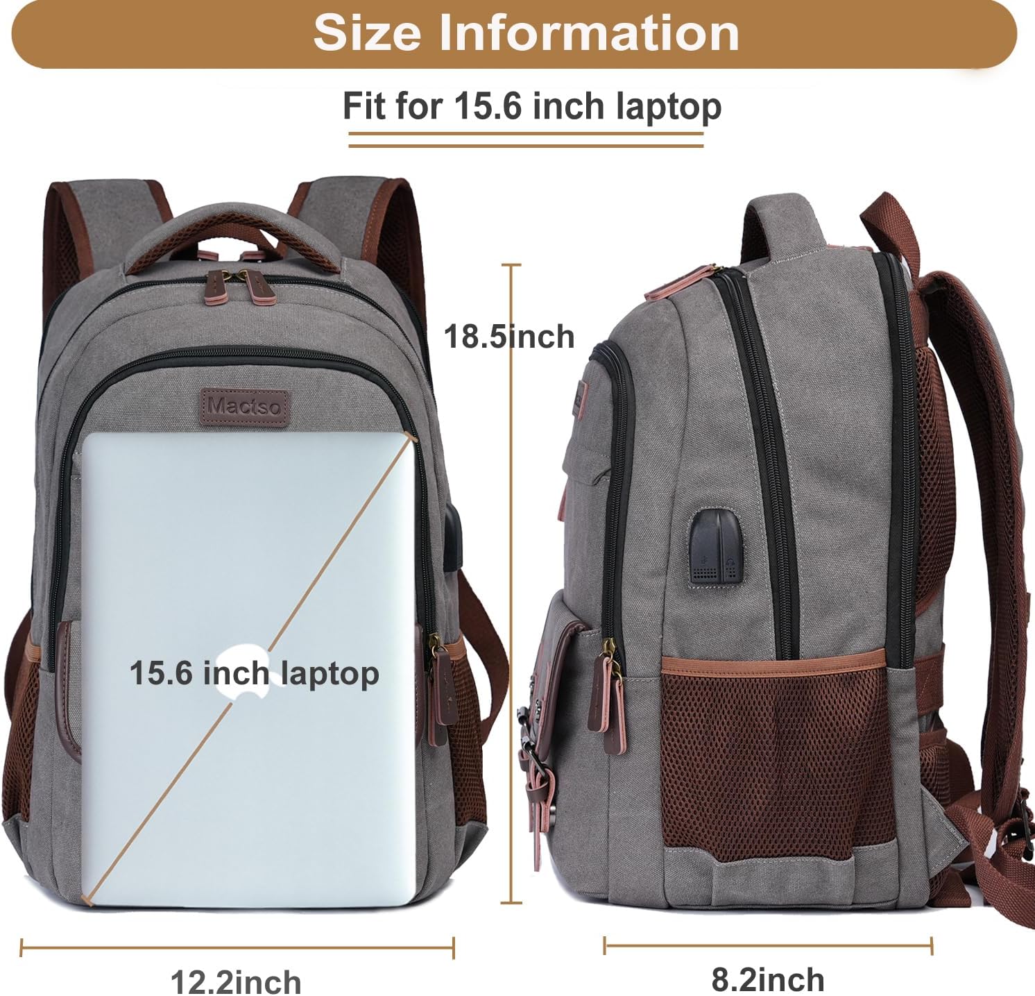 Mactso Canvas Travel Laptop Backpack for Men Women, Business Work Rucksack College School Computer Bag Fits 15.6 Inch Notebook,Bookbag with USB Charging Port (Grey, 15.6 Inch)