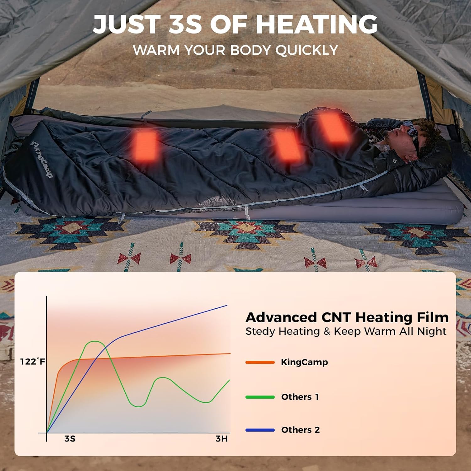 - INSTANT HEAT IN 3 SECONDS-STAY WARM ALL NIGHT: Compatible with any 5V2A or 9V2A power bank, this adult heated sleeping bag delivers instant warmth in just 3 seconds. With a 5V2A power bank, enjoy up to 8 hours of low-temperature heat; using a 9V fast-charging power bank provides up to 6 hours of warmth, ensuring you stay cozy throughout the night. Perfect for heating your shoulders, back, hips, and feet – no more cold, restless nights. (Power bank not included.)