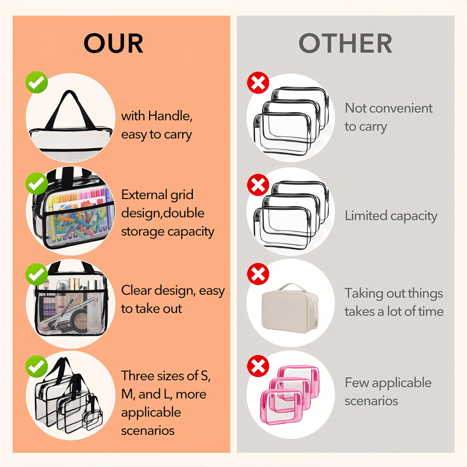 - 【Portable & Reusable with Easy Cleaning】Designed with a sturdy handle, these clear toiletry bags are convenient to carry, whether you're heading to the gym, travel, office, beach, or camping. PVC material is easy to clean after use, just wipe it with a cloth to keep them looking fresh and ready for your next trip.