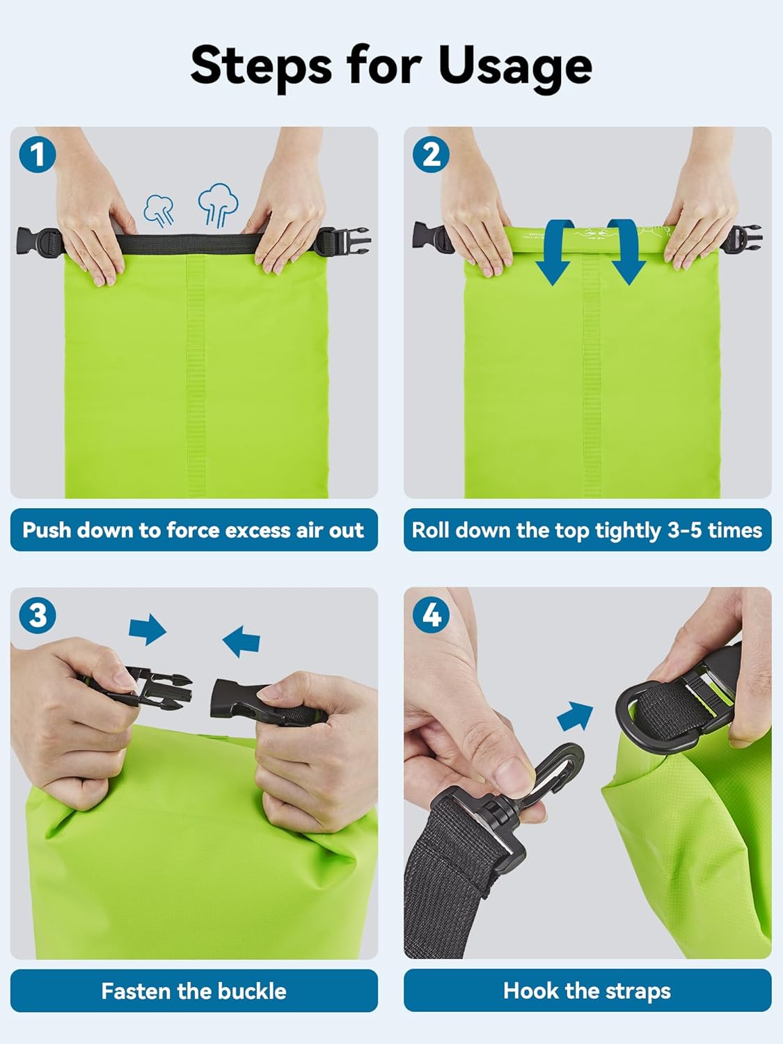 - Multifunctional - Equipped with adjustable shoulder straps for shoulder carrying and backpack, our dry bag is very convenient for different occasions like boating, rafting, kayaking, hiking, camping, fishing, mountaineering, etc. The lightweight dry bag won't weigh down your arms or shoulders
