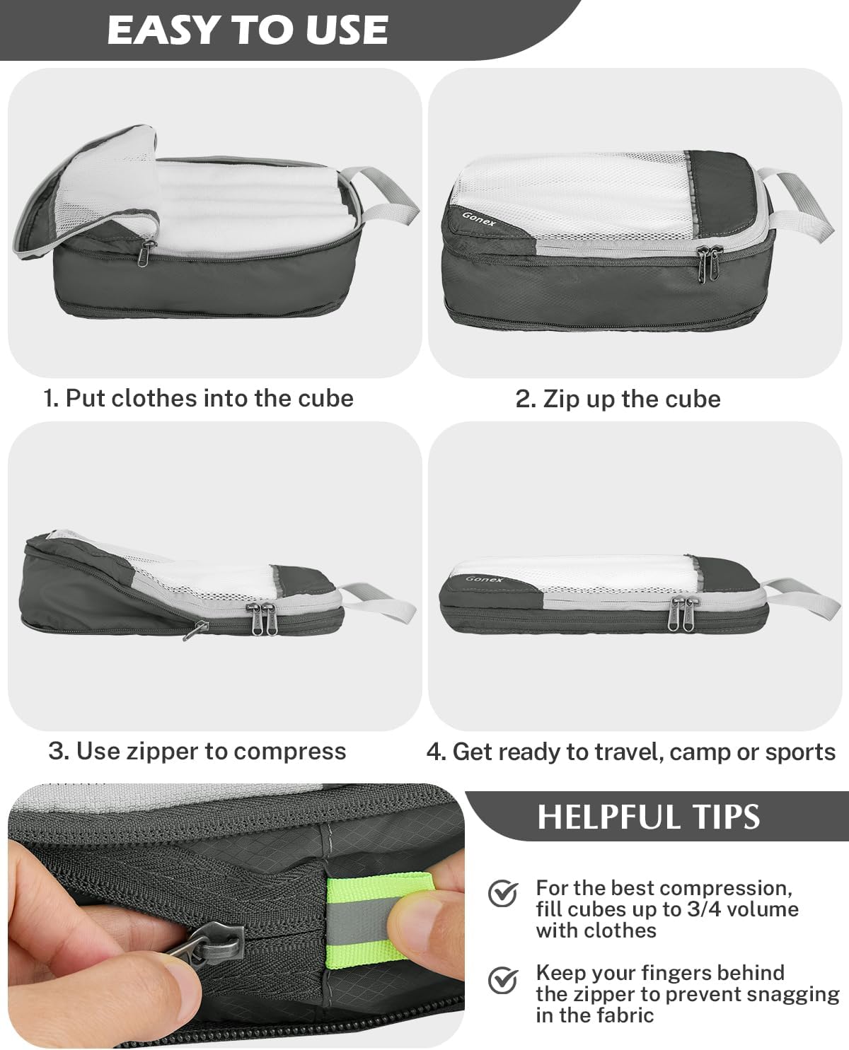 - Space Saver: Double zippers of the packing cube work perfectly in compressing clothes to help save space in your carry on luggage or travel backpack. Great travel gear to minimize your carryon size. Quick grab handle for easy access to pulling out packed cubes from suitcase or backpack.
