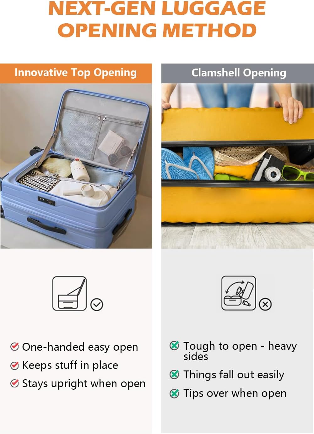 - INNOVATIVE FRONT OPENING: Experience effortless packing with our unique top-opening design. Access your belongings with ease, save space, and enjoy a more organized travel experience. Say goodbye to the inconvenience of traditional side-opening luggage.