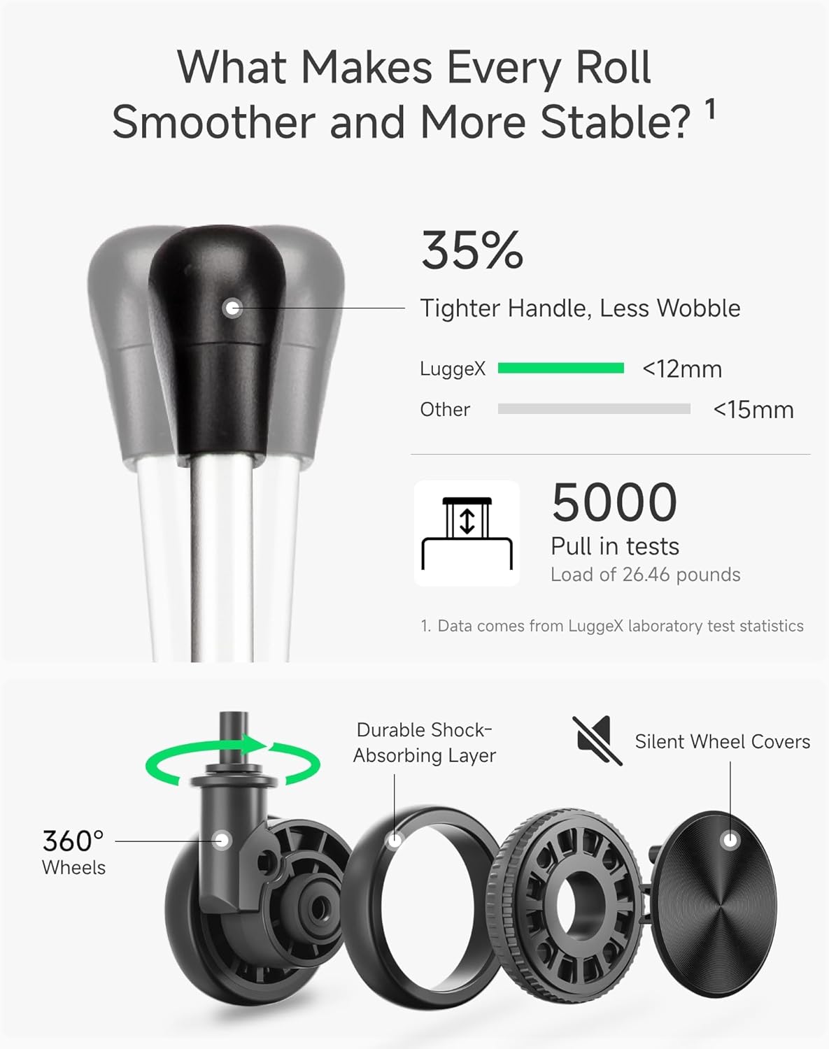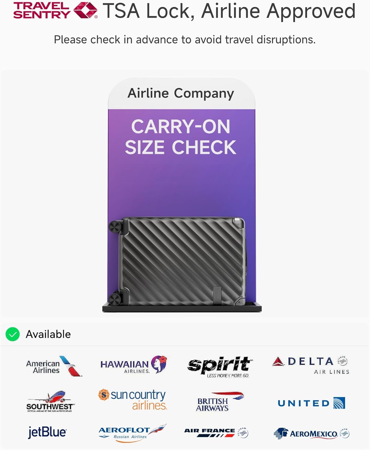 - Glide with 360° Ease: The carry on suitcases with wheels features 8 silent spinner wheels that rotate smoothly in every direction, allowing you to maneuver through busy airports, cobblestone streets, or hotel lobbies, fluid movement wherever you go.