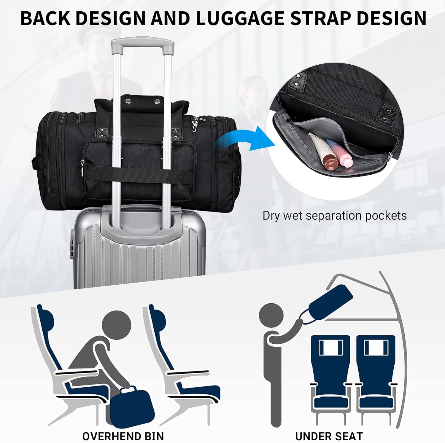 - Expandable Design and Dry Wet Separation Design :Dimensions:22"L x 12"H x 9.8" W, dimensions after extended 26 x 12 x 9.8 inch.Don't fear bringing an extra set of clothes and having no place to place them.The back zipper pocket of the luggage bag is made of water-resistant PVC material, which can be classified as towels, and toiletries,etc.