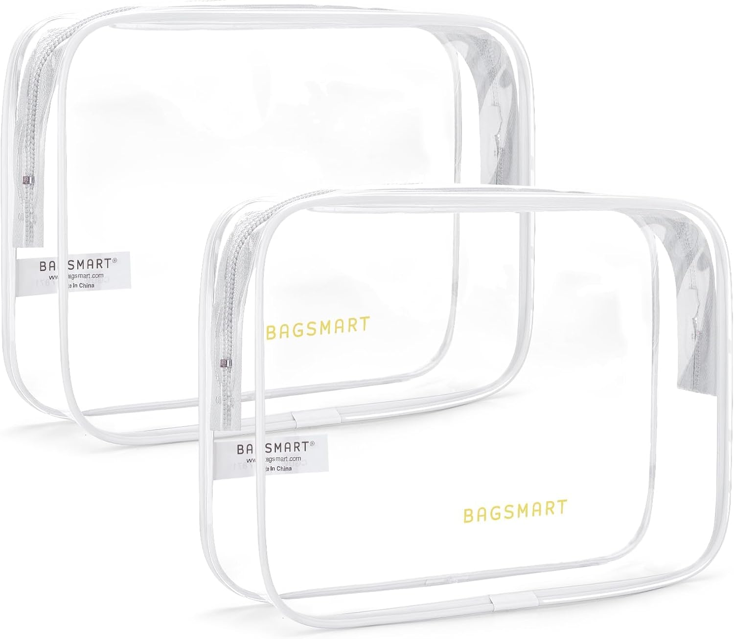 BAGSMART Clear Toiletry Bag, 2 Packs TSA Approved Water Resistant Quart Size Travel Organizer, Airport Airline Travel Essential Carry On Makeup Cosmetic Bags for Women, White