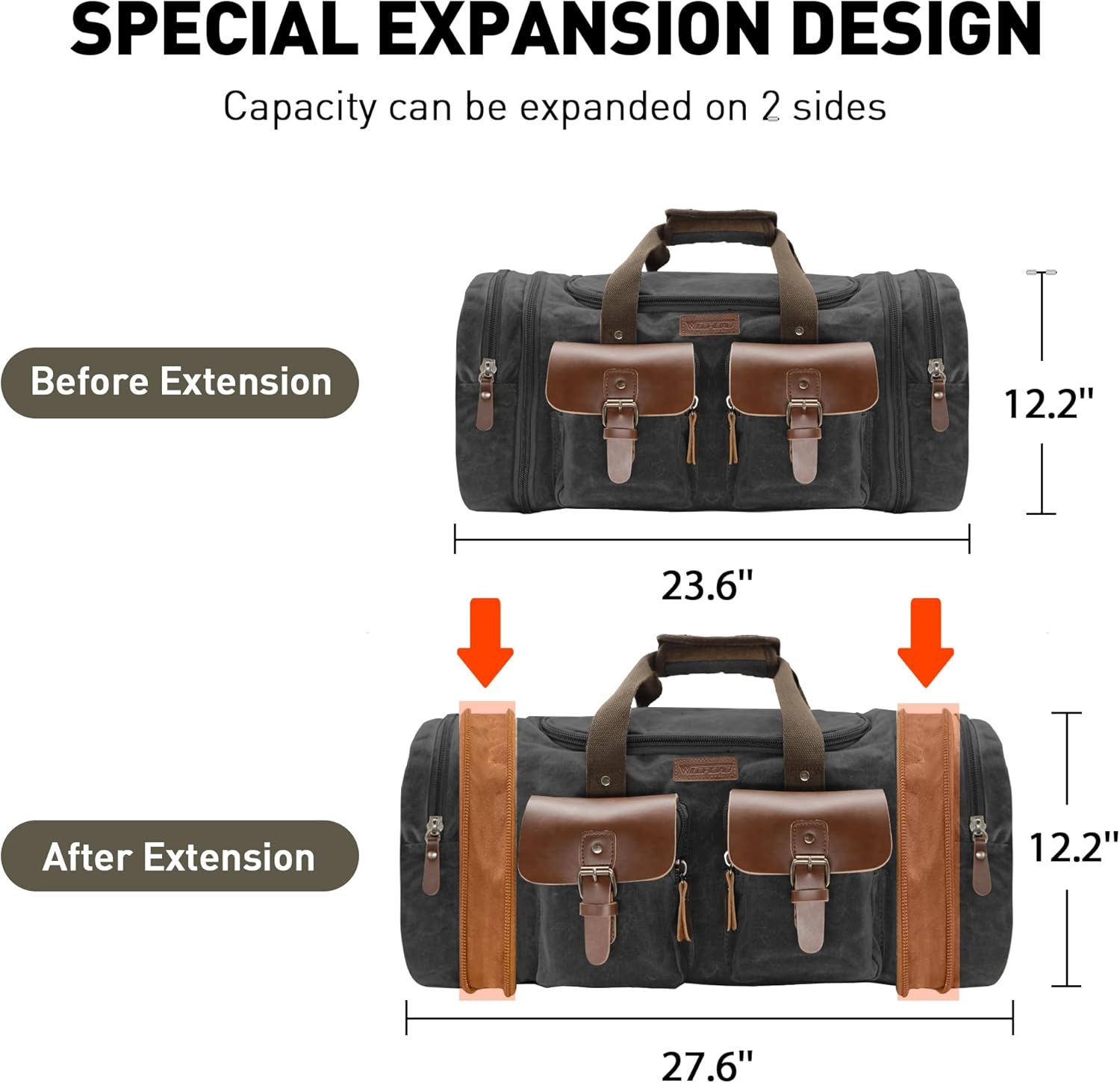 Wildroad 60L Travel Duffel Bag, Expandable Waxed Canvas Genuine Leather Duffle Bag Upgraded Overnight Weekender Bag Carry on Bag (Vintage Black, X Large-60L)