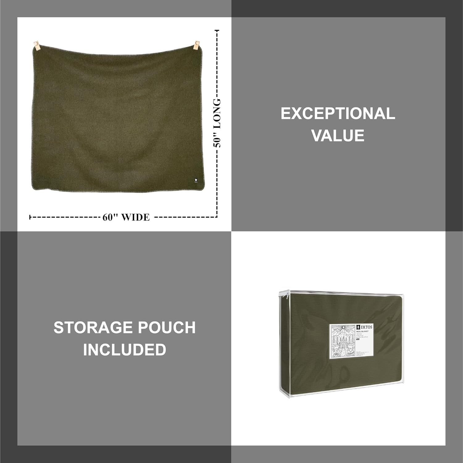 EKTOS 100% Virgin Wool Blanket, 50" x 60", Perfect for Camping, Outdoor Essentials (Olive Green, Throw Size)