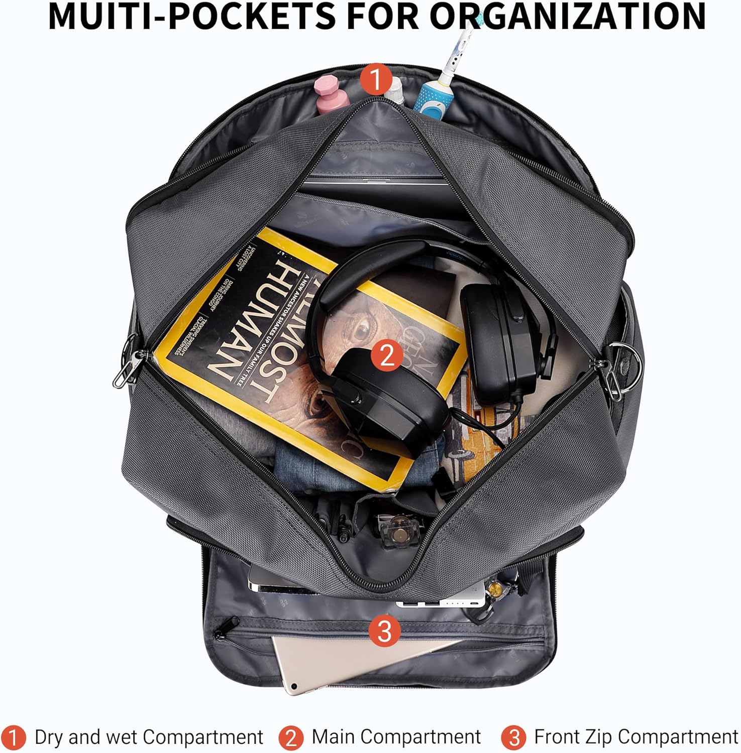 - Structure:On front there are 1 zippered pockets (1 zipper pocket and 2 open pockets.) and 1 magnetic buckle pockets.The bottom features a dry wet separation design and shoe compartment. Velcro pockets on either side.Behind are 1 zippered pocket and luggage straps.Two big open pockets.Main internal pockets : 1 zipper pocket,4 open pockets and 2 open insertion pockets,Computer Pockets:fit in 15.6" laptop pockets and 2 open pockets.
