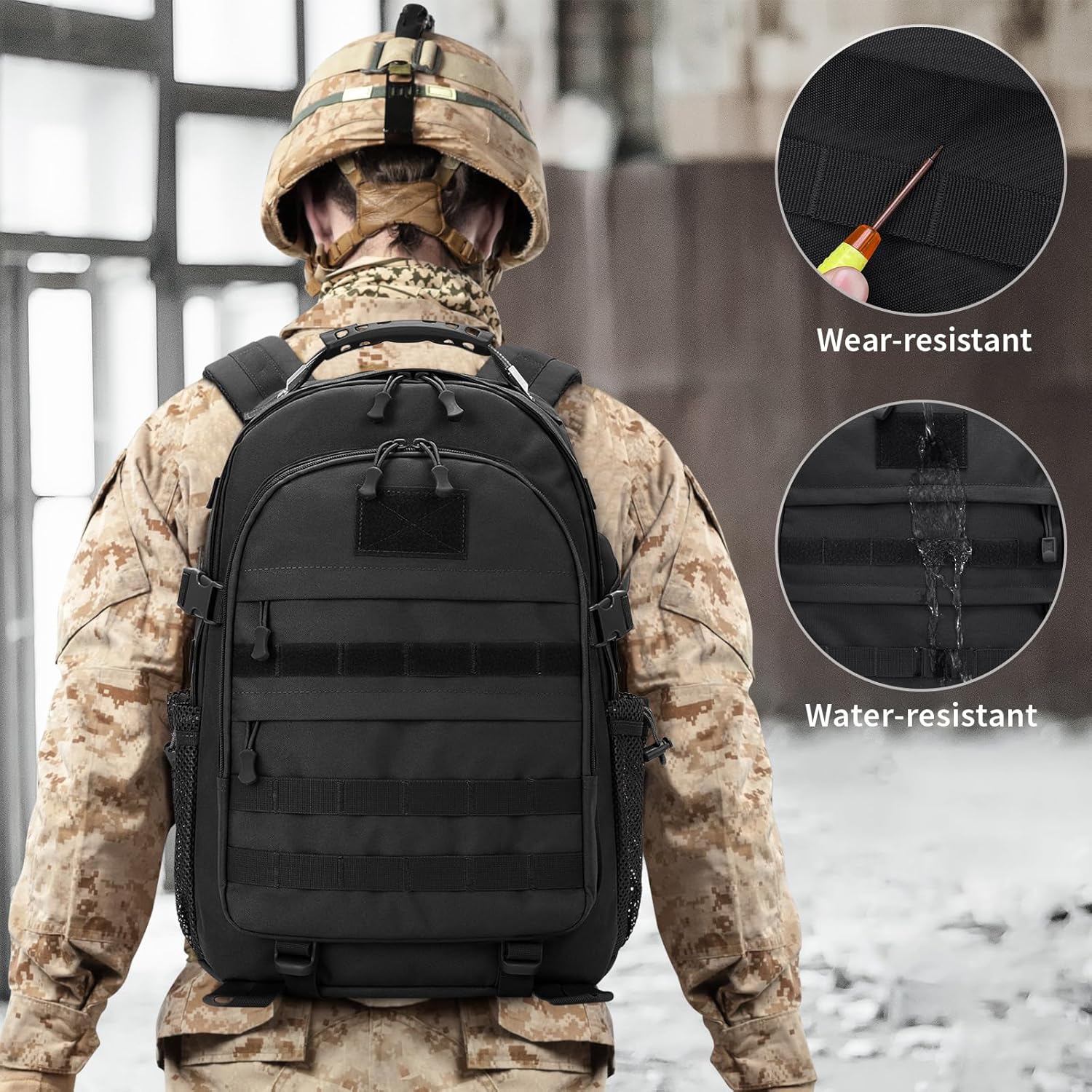 - Military Backpack Main Pocket: The mens tactical backpack fits 16.5-inch laptop. Side Pocket: Holds a 500ml water bottle. Front pocket: Toiletries and other accessories. Small Front Pocket: Holds cell phone and mobile power. High-strength military specification nylon, scratch resistant and colorfast. This field backpack is water resistant.