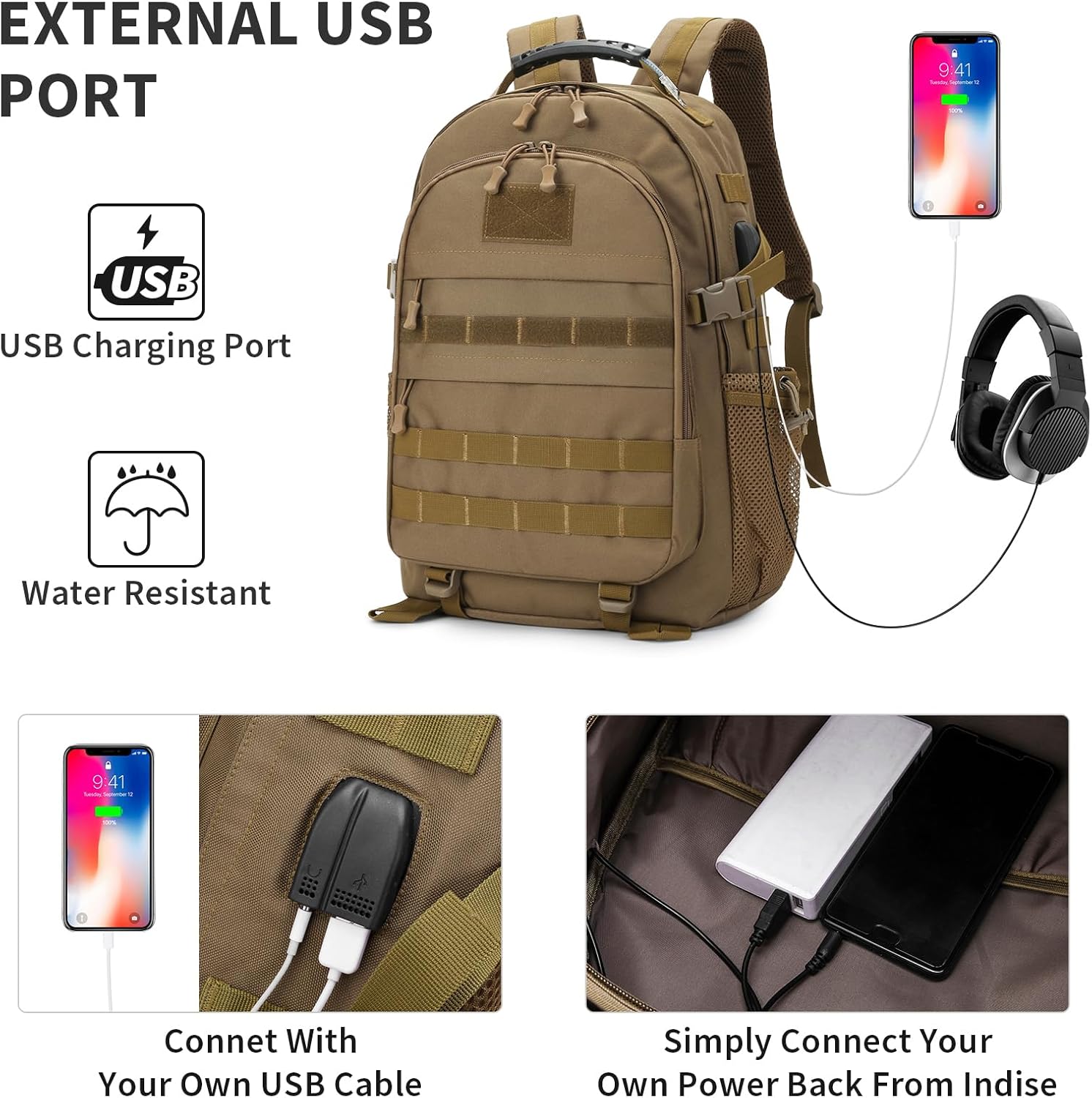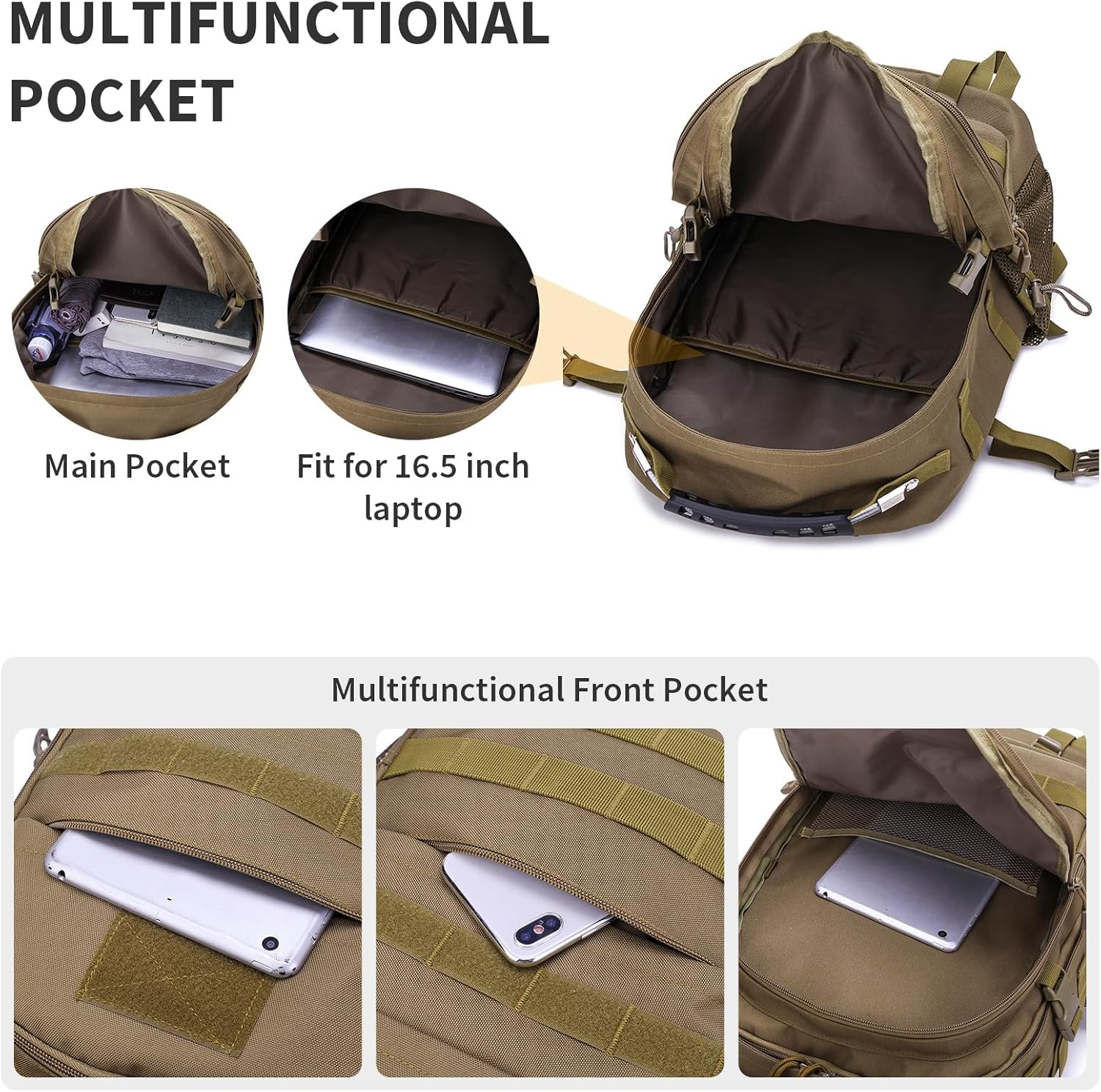 - Military Backpack Main Pocket: The mens tactical backpack fits 16.5-inch laptop. Side Pocket: Holds a 500ml water bottle. Front pocket: Toiletries and other accessories. Small Front Pocket: Holds cell phone and mobile power. High-strength military specification nylon, scratch resistant and colorfast. This field backpack is water resistant.