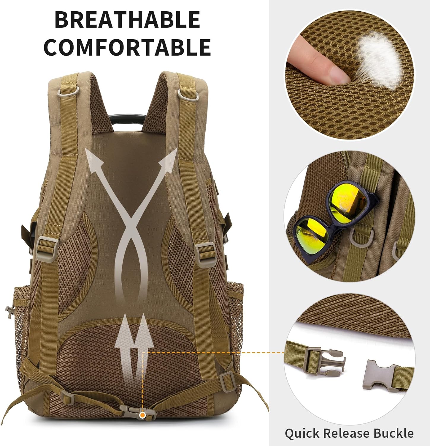 - The shoulder straps of the tactical backpack are thickly padded and comfortable to wear. The back is made of mesh breathable fabric with strong elasticity, which can effectively reduce the burden. Play a good role in shoulder protection, breathable sweat, comfortable.