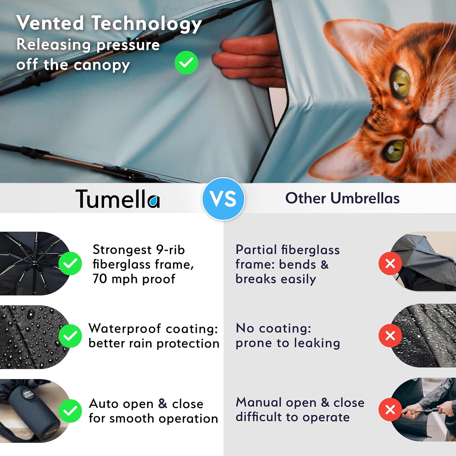 TUMELLA Strongest Windproof Travel Umbrella (Compact, Superior & Beautiful), Small Strong but Light Portable and Automatic Folding Rain Umbrella, Durable Premium Grip, Fits Car & Backpack