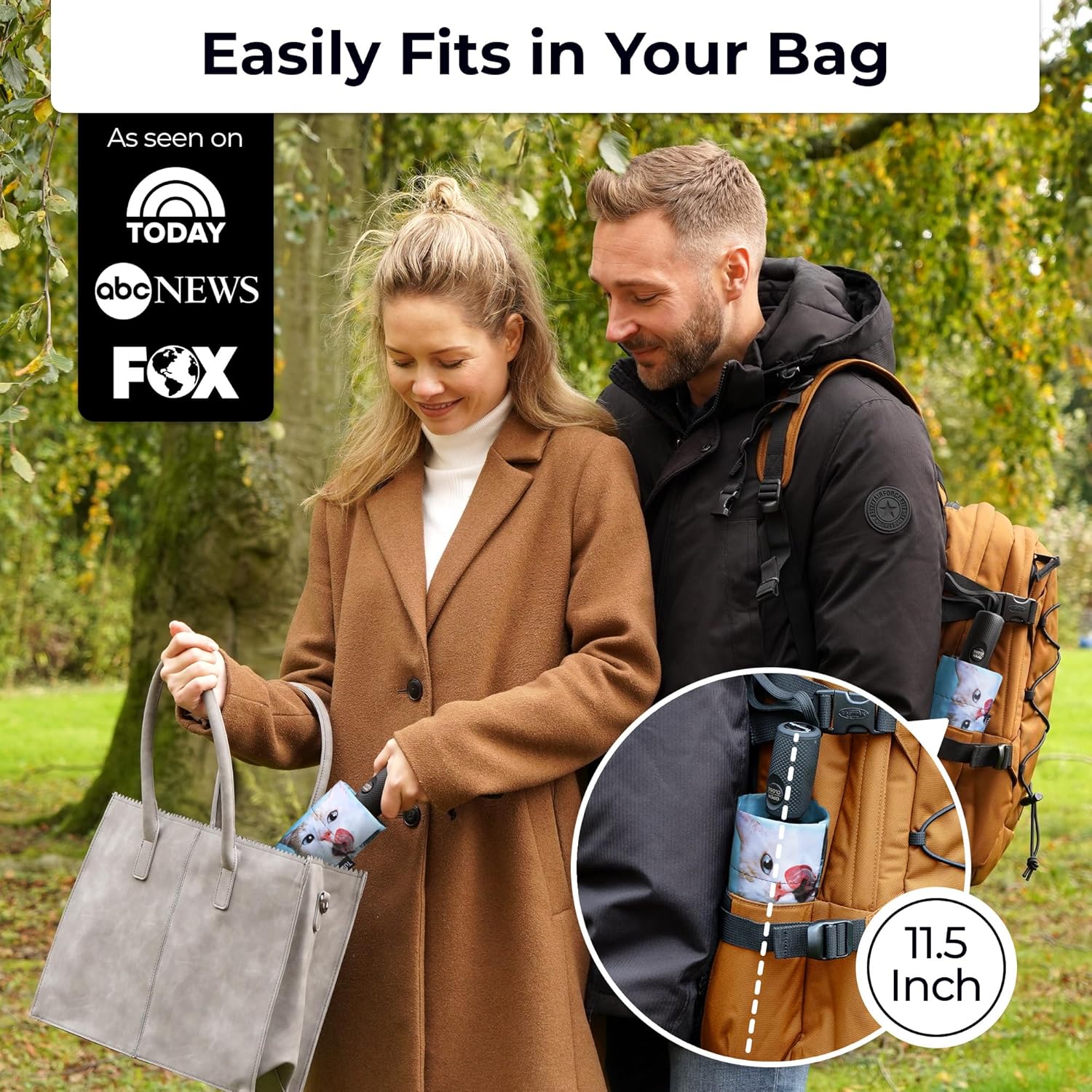 • LIGHTWEIGHT, EASY ONE-HANDED USE, SMALL & PORTABLE: Take this compact umbrella for travel with you wherever you go. So versatile and simple to use, with just the touch of a button, you can automatically open or close your Tumella. It fits perfectly in your backpack, purse, or car door, with just 11 by 2.75 inches in size, weights less than 1 lb, while offering a huge coverage of 42 inch.