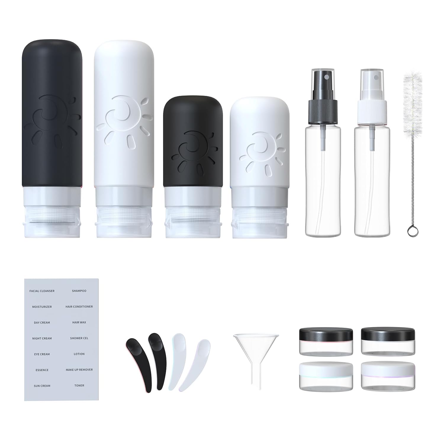 - 【Multi-combination Set】The travel container set includes 4 travel bottles, 4 travel jars, 2 spray bottles, 4 spoons, 1 funnel, 1 cleaning brush, and 1 label, as well as 1 transparent makeup bag. They are portable and lightweight, easy to carry and clean. perfect for business or personal travel, and fun outdoors.