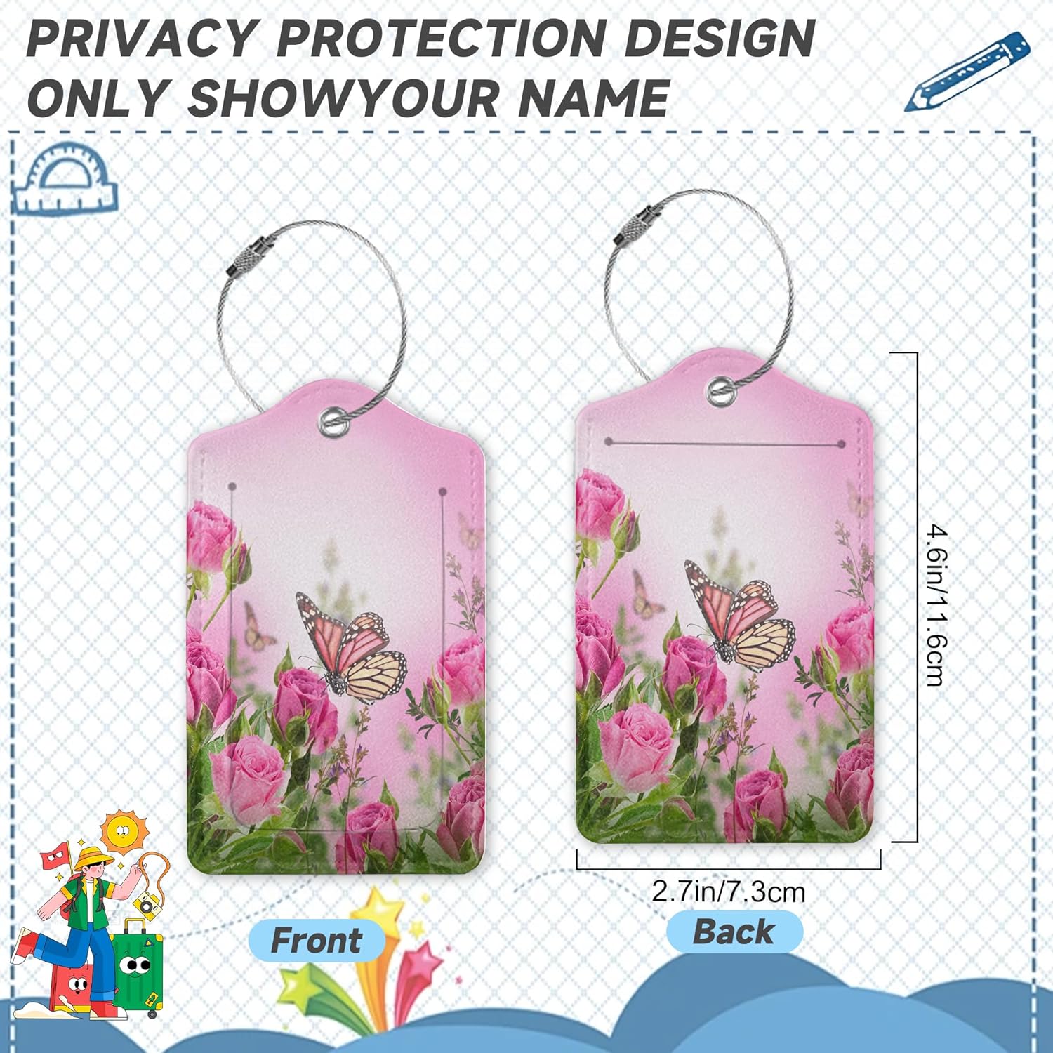 2 Pack Luggage TagsButterfly Rose Floral with Stainless Steel Loop and Privacy Cover for Women Men Travel Luggage Accessories