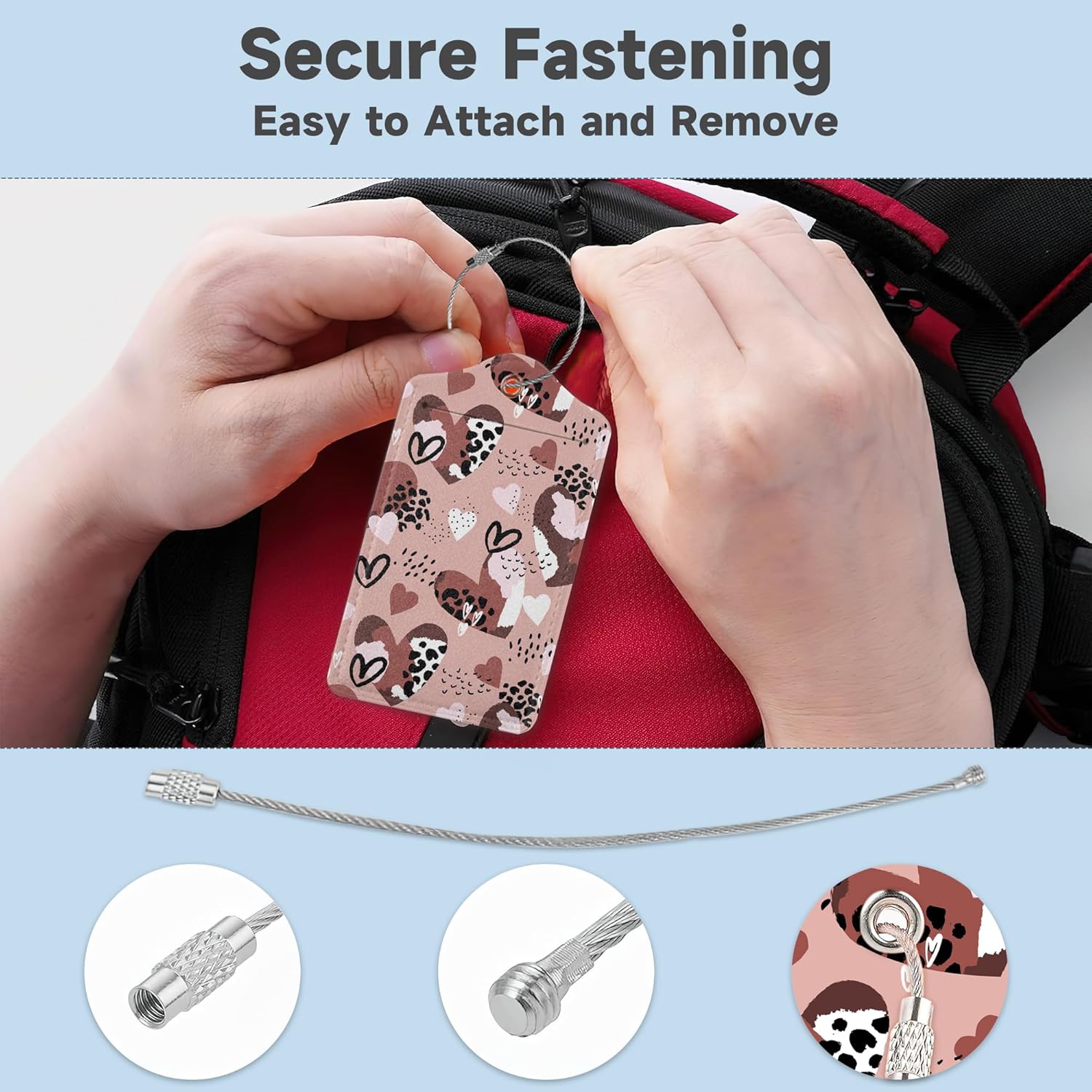 Set of 2 Luggage Tag for Suitcases LeatherAbstract Leopard Print Hearts Tags with Stainless Steel Loop Privacy Name ID Card Cover Travel Bag Labels Set for Women Men Kids Girls