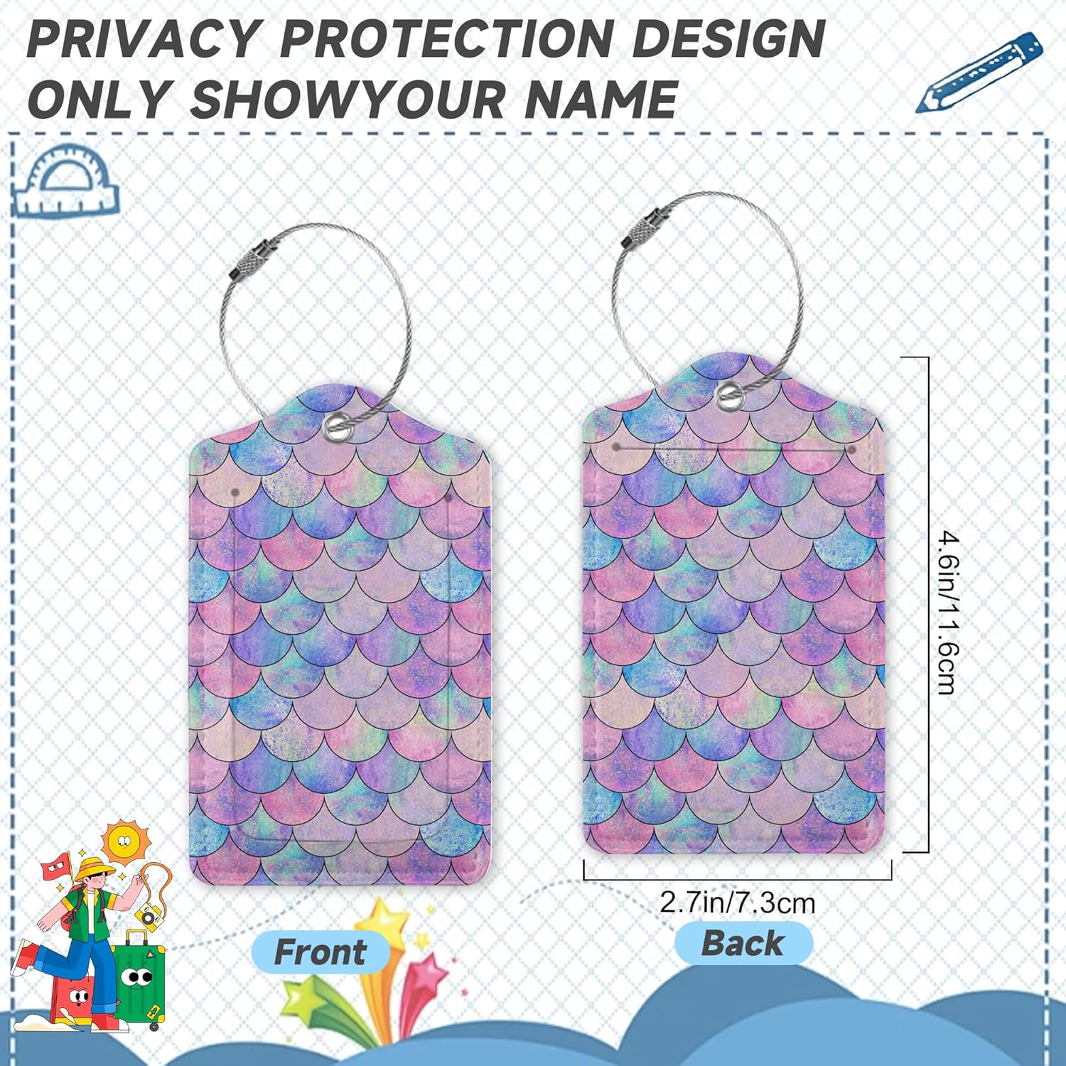 Set of 2 Luggage Tag for Suitcases LeatherMermaid Fish Scale Wave Tags with Stainless Steel Loop Privacy Name ID Card Cover Travel Bag Labels Set for Women Men Kids Girls