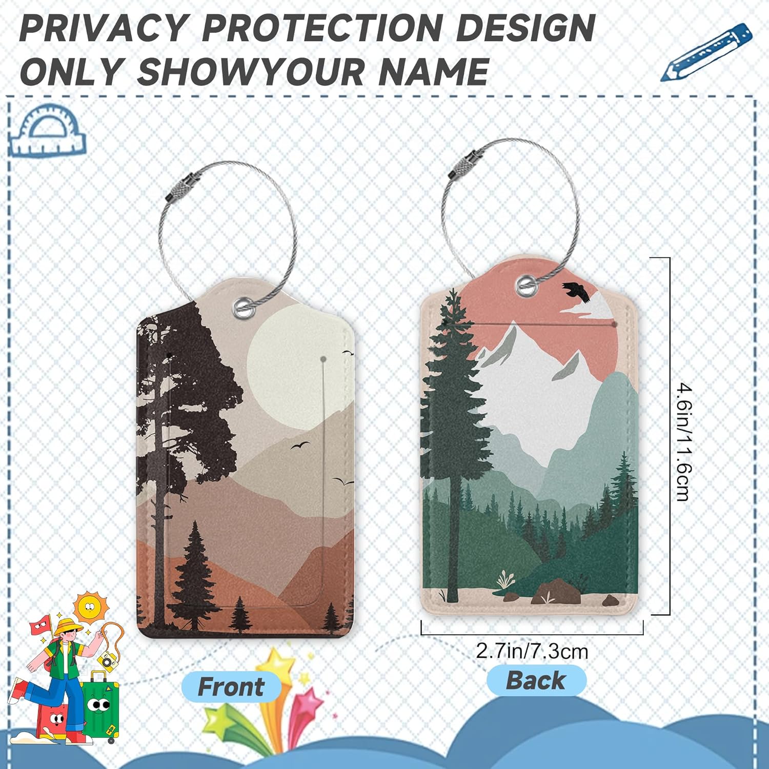 2 Pack Luggage Tag for Suitcase, Landscape Pine Trees Mountains Leather Bag Tags Identifiers Privacy Cover ID Label with Durable Steel Loop for Women Men Kids Girls Travel