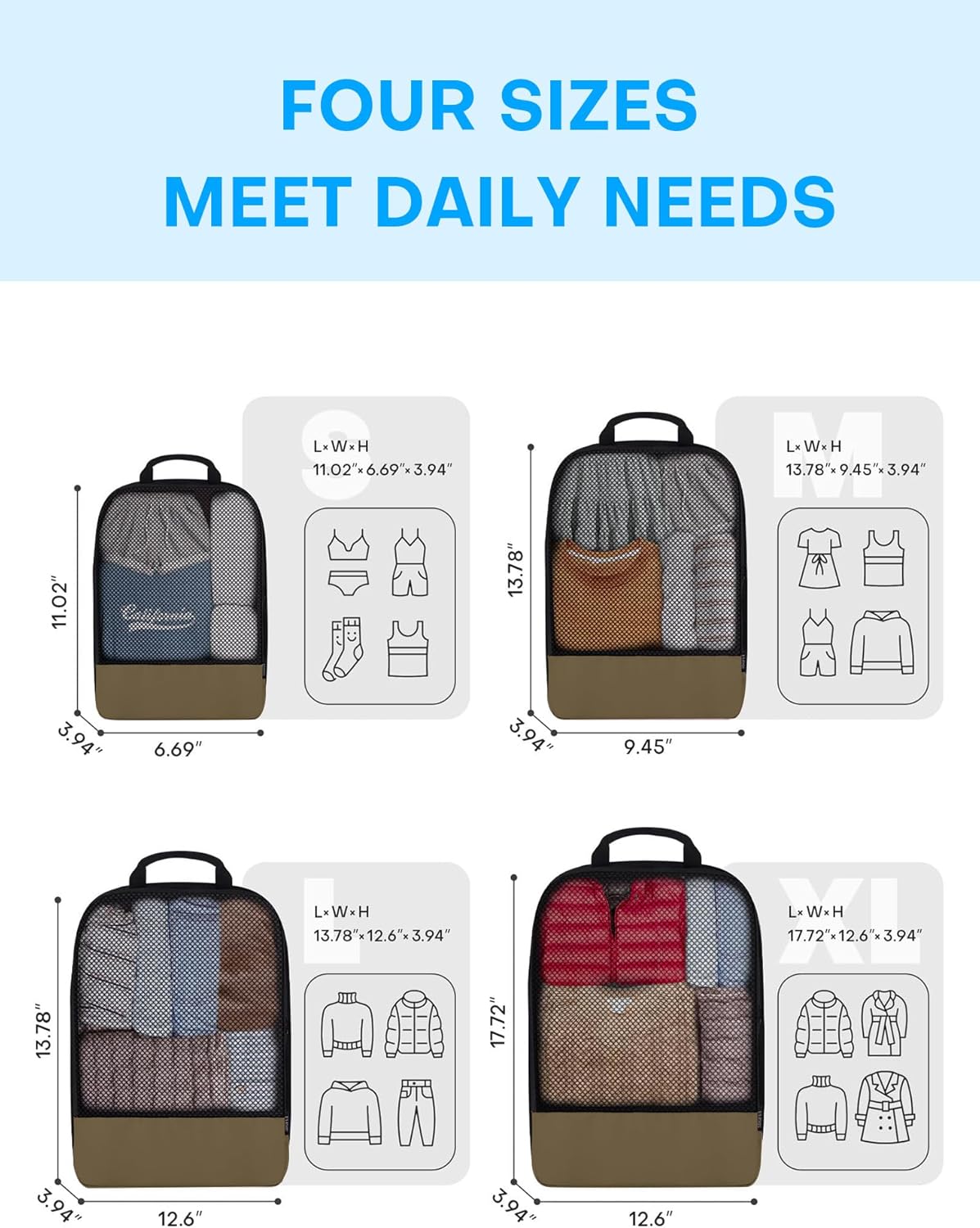 - Versatile & Flexible: Our packing organizer features 4 different sizes organizers for different items: L-M-S-XS for essentials like jackets, shirts, spants, underwear, toiletries, and more. Laundry bag keeps soiled clothing separate.