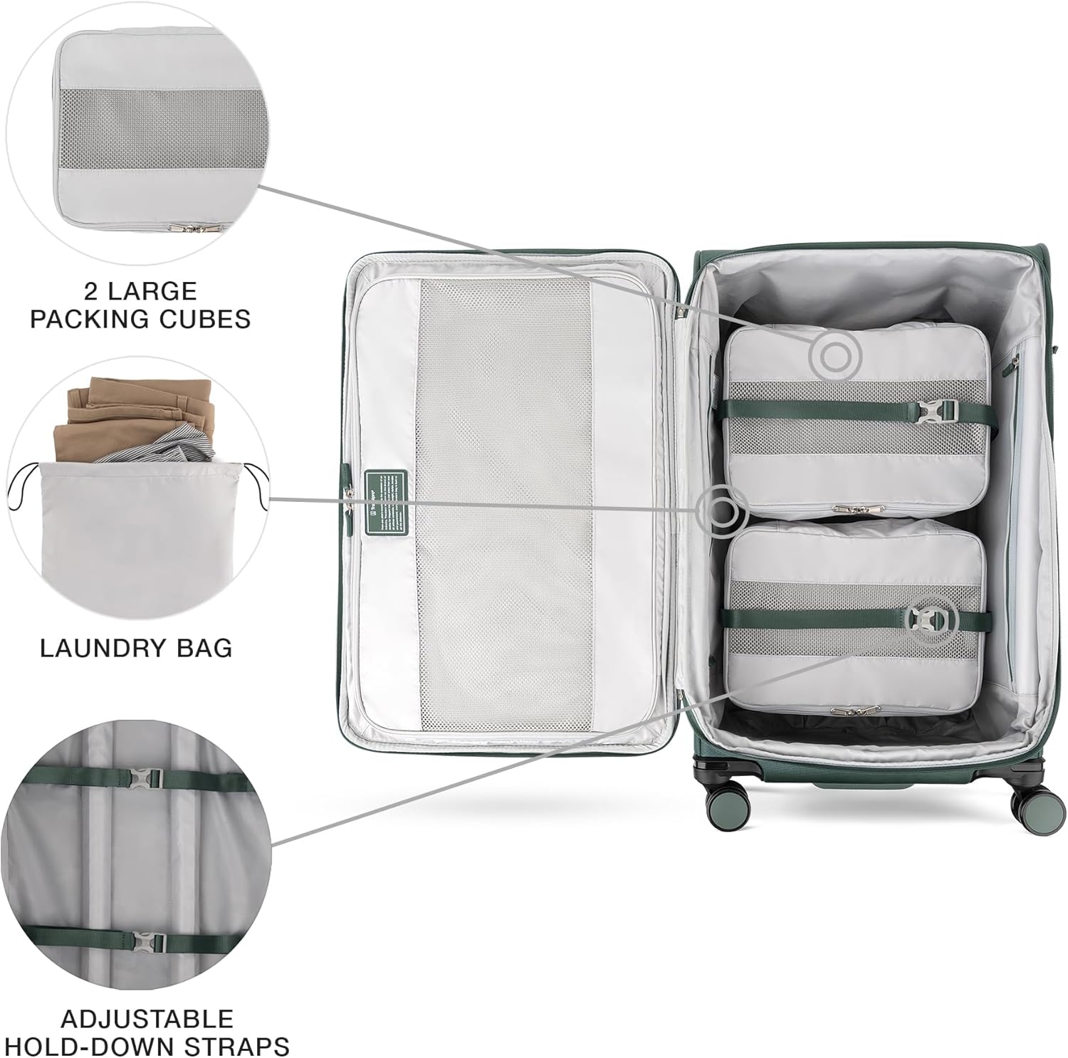 - Softside luggage has ECOFAB interior lining with H2O guard is made from 100% post-consumer recycled plastic bottles (Approx. 15.5 bottles). DIMENSIONS: Overall (includes wheels & handles) 30.75 in x 18 in x 13.25 in, Case: 27.75 in x 17 in x 12.75 in