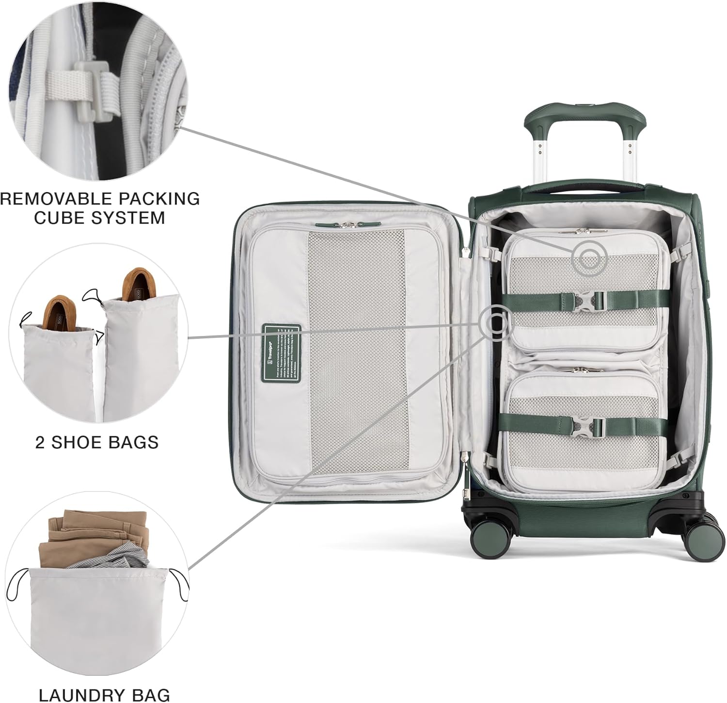 - Carry on is sizer bin tested to fit in the overhead bins of most major domestic airlines. Includes compression packing cube system, two removable shoe bags and a removable laundry bag. YKK zippers ensure smooth operation (Repair kit included).