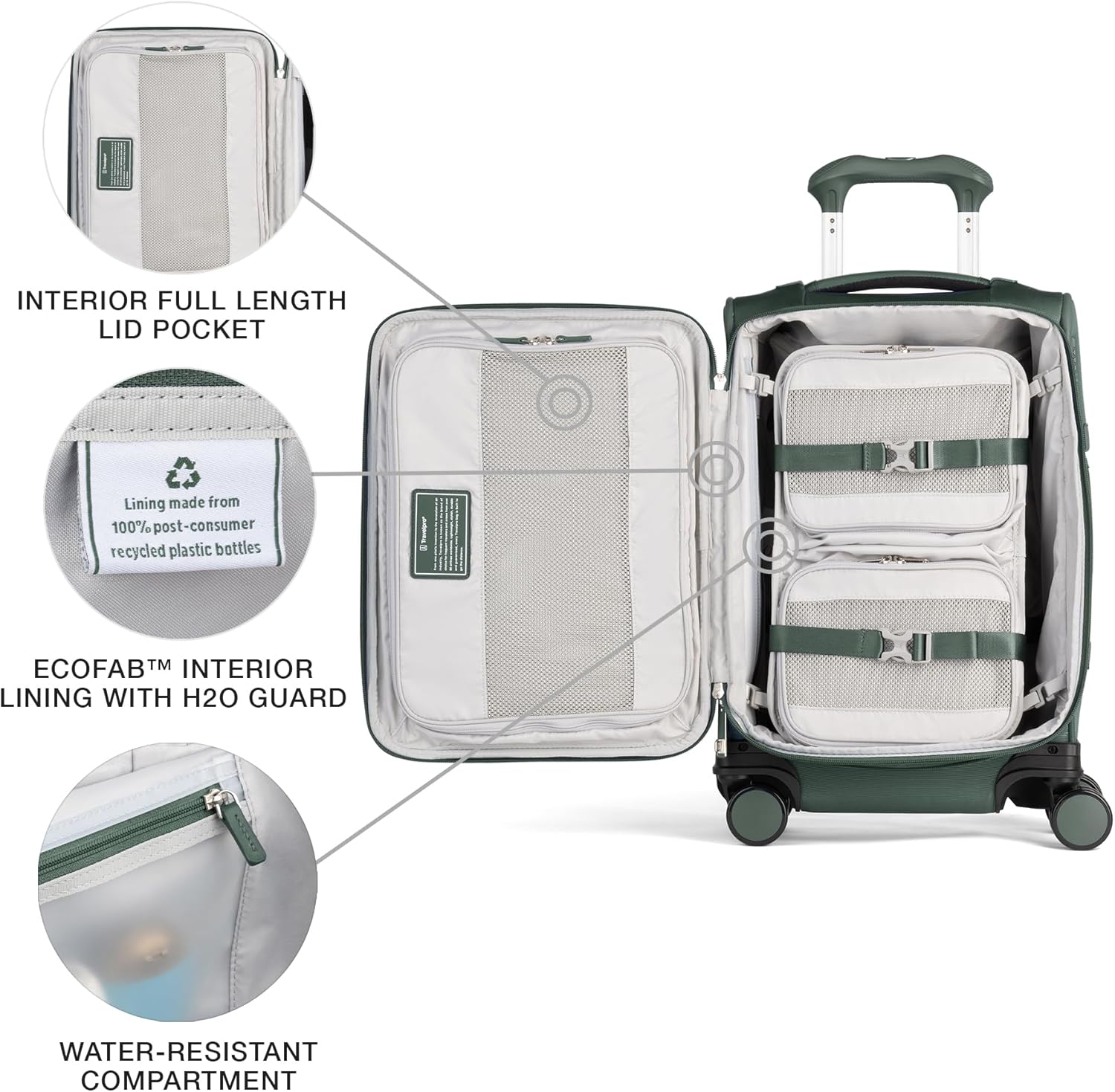 - Softside luggage has ECOFAB interior lining with H2O guard is made from 100% post-consumer recycled plastic bottles (Approx. 12.5 bottles). DIMENSIONS: Overall (includes wheels & handles) 23 in x 14.5 in x 9.5 in, Case: 20.5 in x 13.75 in x 9 in.