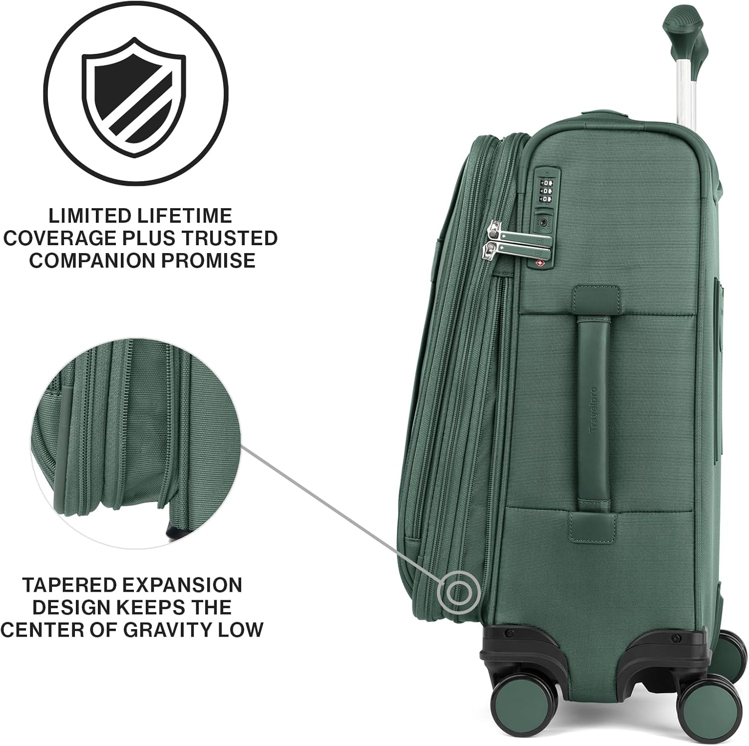 - Suitcase has PrecisionGlide System that delivers precise control and effortless roll on eight ultra-durable, 360° MagnaTrac self-aligning spinner wheels led by an airline-grade 4- stop PowerScope Extension Handle with comfortable Contour Grip.