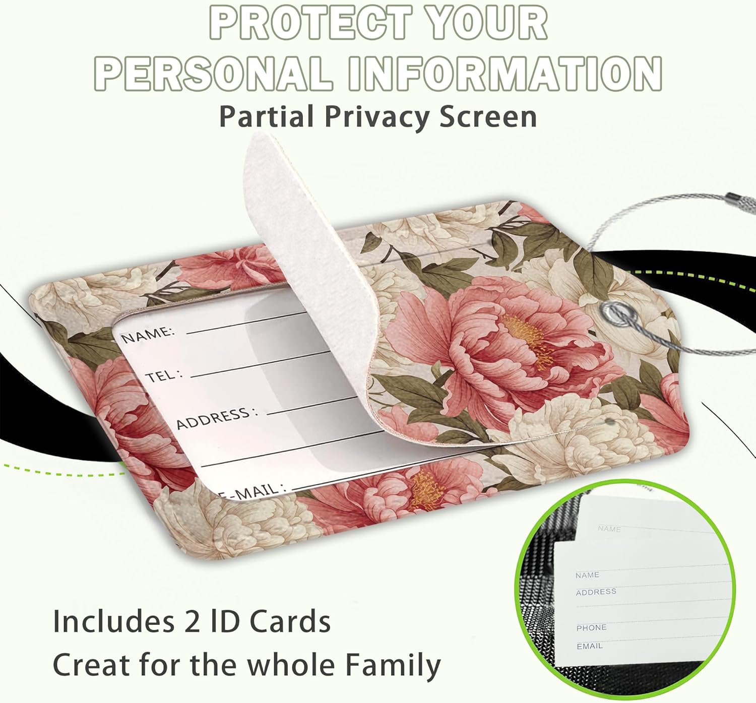 2 Pcs Peony Pink Flowers Retro Luggage Tags,Cruise Luggage Tag with Privacy Flap,Name Id Label and Steel Loop for Women Men Travel Bag Suitcase