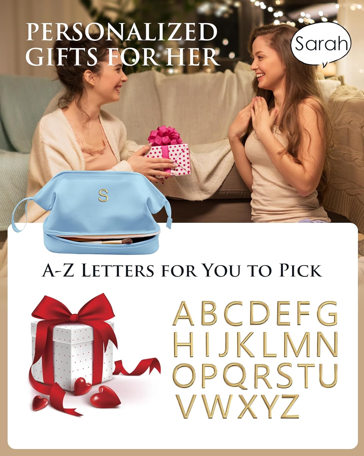 Daughter Birthday Gifts, Initial Makeup Bag, Personalized Double Layer Cosmetic Bag with Makeup Brush Organizer, 10 11 12 13 14 15 16 18 19 Year Old Girl Birthday Gifts, Gift for Wife
