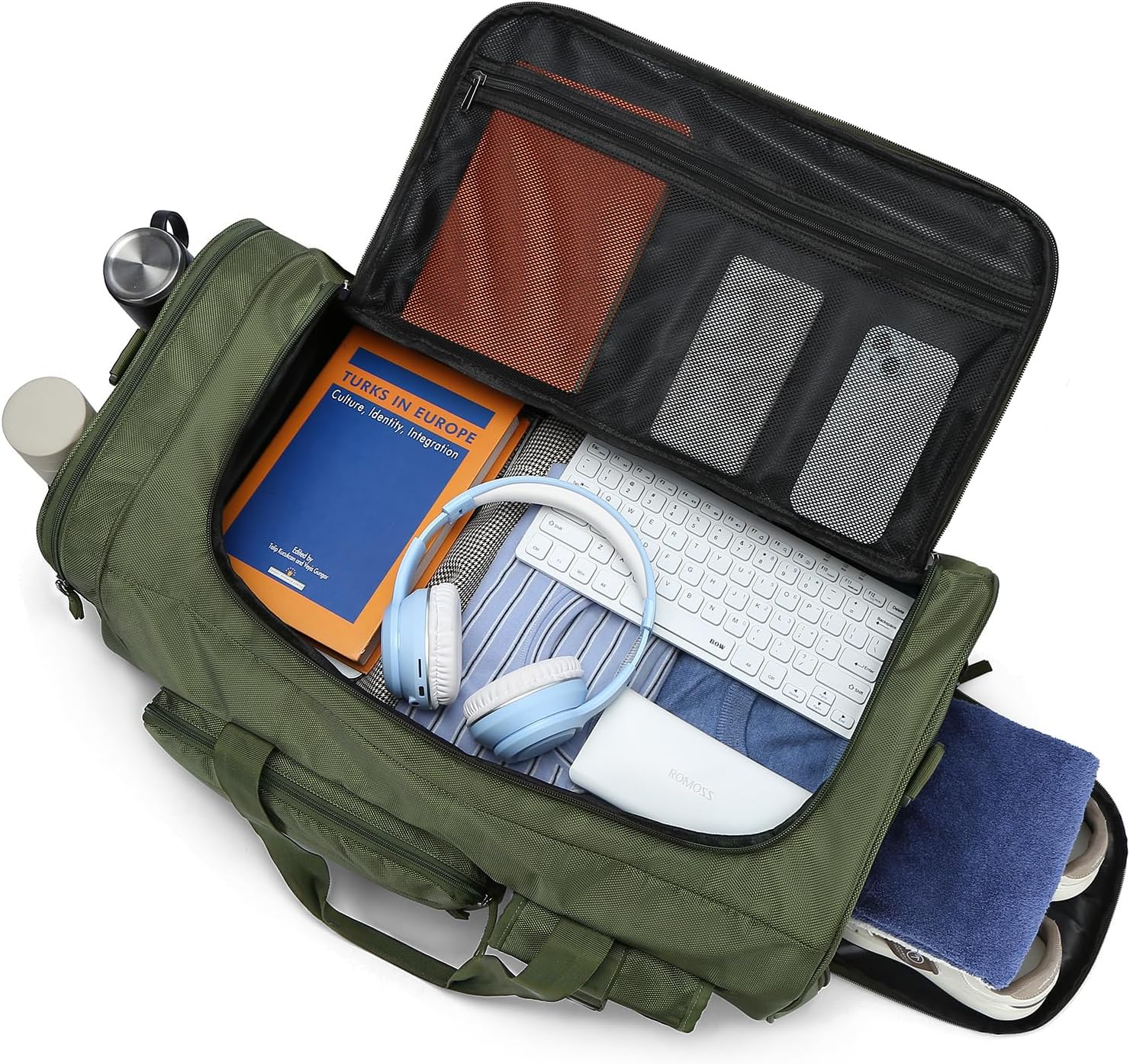 - 【Multifunctional Pockets & Design】Our duffle bag backpack has a total of 11 pockets. Includes 1 large internal mesh pocket and 2 internal zipper pockets; Outside: 2 front zip pockets, 1 flap pocket, 1 side zip pocket and 2 mesh water bottle pockets, 1 shoes compartment, 1 trolley luggage sleeve. The bottom zip pocket hides the backpack straps when not in use. And the elastic cord on top provides additional storage space for jackets or towels.