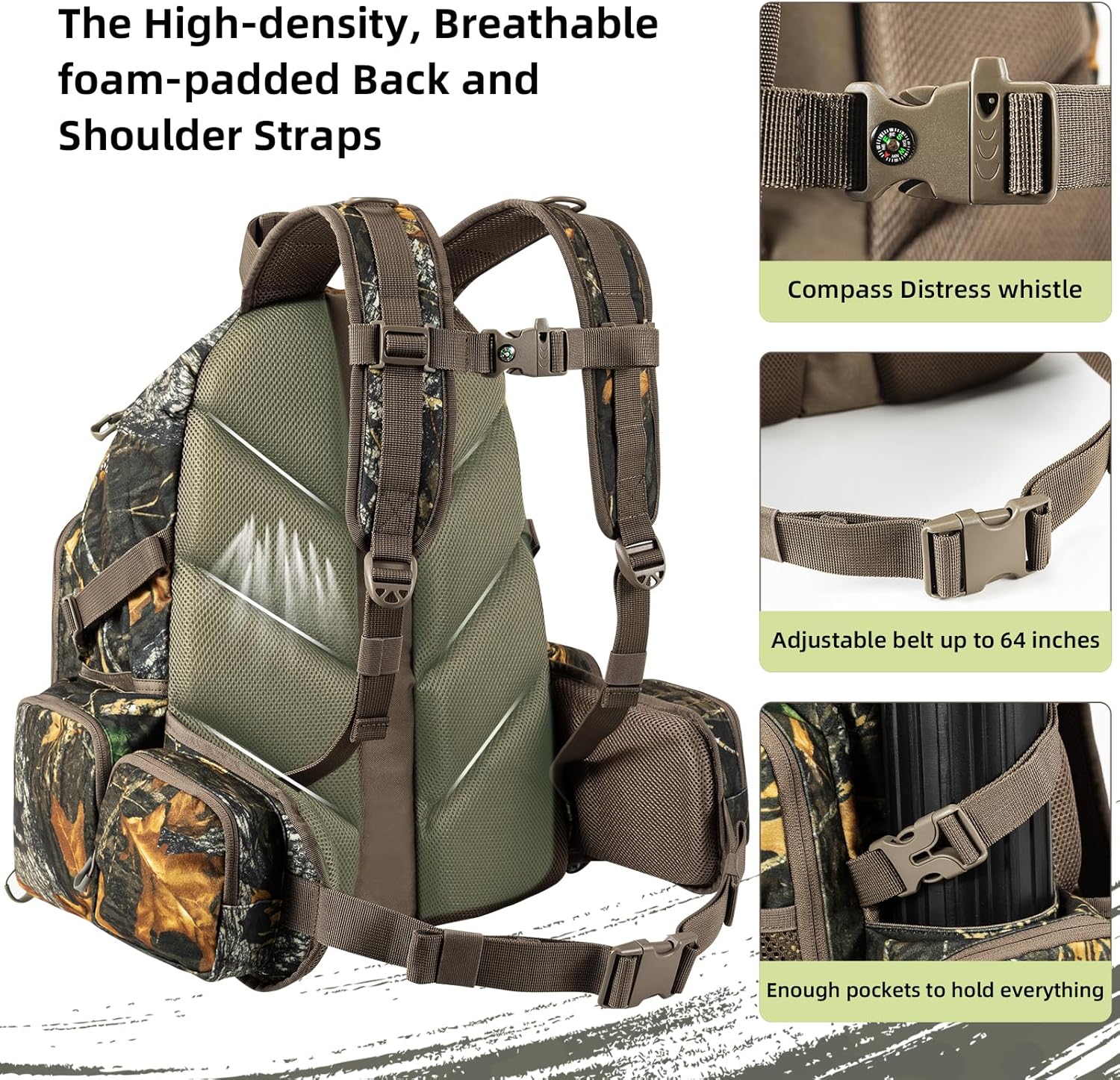 - 【Professional Design】This tactical hunting backpack comes with a compass and survival whistle. Multi-pocket design, can carry a water bag, can be expanded by external connection system and d ring storage capacity. It can carry a shotgun or bow as needed, and can easily respond to any situation, and every detail is designed for user convenience.