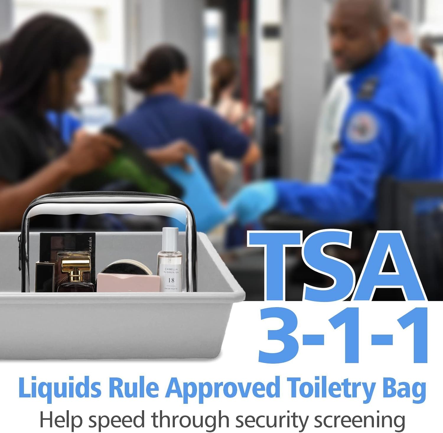 - TSA APPROVED TOILETRY BAG: The TSA certified clear toiletry bag strictly follow 3-1-1 airport regulations, so you don't have to worry about getting through airport security. Clearly see-through to quickly spot whatever you need and pass the security without opening the cosmetic bags.